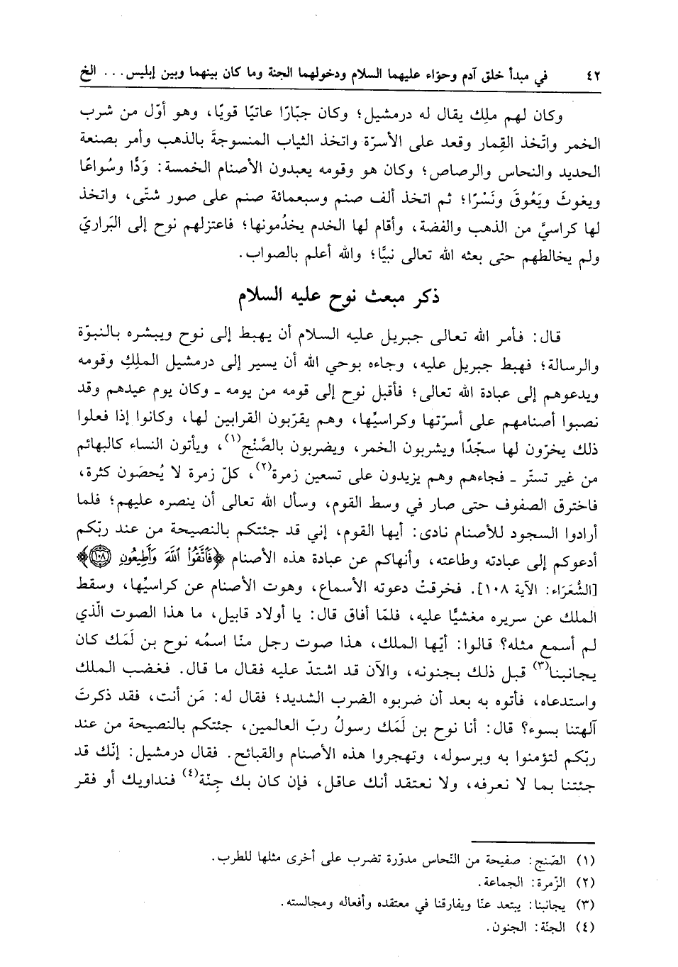 قال : فأمر الله تعالى جبريل عليه السلام أن يهبط إلى نوح ويبشره بالنبوة والرسالة ؛ فهبط جبريل عليه ، وجاءه بوحي الله أن يسير إلى درمشيل الملك وقومه ويدعوهم إلى عبادة الله تعالى ؛ فأقبل نوح إلى قومه من يومه وكان يومن عيدهم وقد نصبوا أصنامهم على أسرتها وكراسيها ، وهم يقربون القرابين لها ، وكانوا إذا فعلوا ذلك يخرون لها سجداً ويشربون الخمر ، ويضربون بالصنج ، ويأتون النساء كالبهائم من غير تستر فجاءهم وهم يزيدون على تسعين زمرة ، كل زمرة لا يحصون كثرة ، فاخترق الصفوف حتى صار في وسط القوم ، وسأل الله تعالى أن ينصره عليهم ؛ فلما أرادوا السجود للأصنام نادى : أيها القوم ، إني قد جئتكم بالنصيحة من عند ربكم أدعوكم إلى عبادته وطاعته ، وأنهاكم عن عبادة هذه الأصنام " فاتقوا الله وأطيعون " . فخرقت دعوته الأسماع ، وهوت الأصنام عن كراسيها ، وسقط الملك عن سريره مغشياً عليه ، فلما أفاق قال : يا أولاد قابيل ، ما هذا الصوت الذي لم أسمع مثله ؟ قالوا : أيها الملك ، هذا صوت رجل منا اسمه نوح بن لمك كان يجانبنا قبل ذلك بجنونه ، والآن قد اشتد عليه فقال ما قال . فغضب الملك واستدعاه ، فأتوه به بعد أن ضربوه الضرب الشديد ؛ فقال له : من أنت ، فقد ذكرت آلهتنا بسوء ؟ قال : أنا نوح بن لمك رسول رب العالمين ، جئتكم بالنصيحة من عند ربكم لتؤمنوا به وبرسوله ، وتهجروا هذه الأصنام والقبائح . فقال درمشيل ؛ إنك قد جئتنا بما لا نعرفه ، ولا نعتقد أنك عاقل ، فإن كان بك جنة فنداويك أو فقر