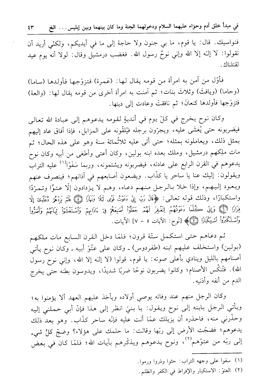 وكان نوح يخرج في كل يوم في أندية لقومه يدعوهم إلى عبادة الله تعالى فيضربونه حتى يغشى عليه ، ويجرون برجله فيلقونه على المزابل ، فإذا أفاق عاد إليهم بمثل ذلك ، ويعاملونه بمثله ؛ حتى أتى عليه ثلاثمائة سنة وهو على هذه الحال ؛ ثم مات ملكهم درمشيل ، وملك بعده ابنه بولين ، وكان أعتى وأطغى من أبيه وكان نوح يدعوهم في القرن الرابع على عادته ، فيضربونه ويشتمونه ، وربما سفوا عليه التراب ويقولون : إليك عنا يا ساحر يا كذاب . ويضعون أصابعهم في آذانهم ؛ فينصرف عنهم ويعد إليهم ، وإذا خلا بالرجل منهم دعاه ، وهم لا يزدادون إلا عتوا وتمرداً واستكباراً ، وذلك قوله تعالى : " قال رب إني دعوت قومي ليلاً ونهاراً فلم يزدهم دعائي إلا فراراً وإني كلما دعوتهم لتغفر لهم جعلوا أصابعهم في آذانهم واستغشوا ثيابهم وأصروا واستكبروا استكباراً " الآيات .