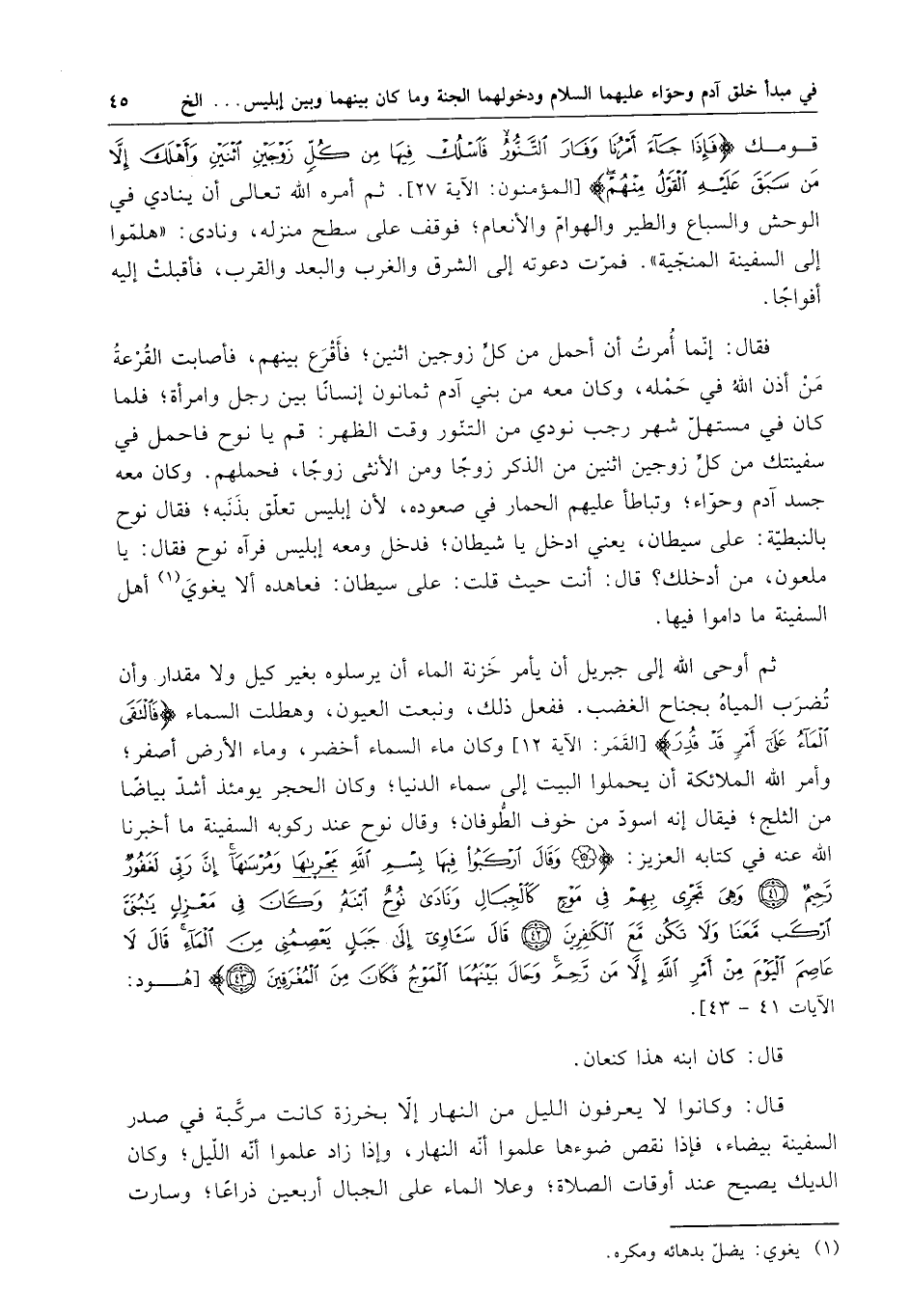 فقال : إنما أمرت أن أحمل من كل زوجين اثنين ، فأقرع بينهم ، فأصابت القرعة من أذن الله في حمله ، وكان معه من بني آدم ثمانون إنساناً بني رجل وامرأة ؛ فلما كان في مستهل شهر رجب نودي من التنور وقت الظهر : قم يا نوح فاحمل في سفينتك من كل زوجي اثنين من الذكر زوجاً ومن الأنثى زوجاً ، فحملها . وكان معه جسد آدم وحواء ؛ وتباطأ عليهم الحمار في صعوده ، لأن إبليس تعلق بذنبه ؛ فقال نوح بالنبطية : على سيطان ، يعني ادخل يا شيطان ؛ فدخل ومعه إبليس فرآه نوح فقال : يا ملعون ، من أدخلك ؟ قال : أنت حيث قلت : على سيطان : فعاهده ألا يغوي أهل السفينة ما داموا فيها ؛ ثم أوحى الله إلى جبريل أن يأمر خزنة الماء أن يرسلوه بغير كيل ولا مقدار وأن تضرب المياه بجناح الغضب . ففعل ذلك ، ونبعت العيون ، وهطلت السماء " فالتقى الماء على أمر قد قدر " وكان ماء السماء أخضر ، وماء الأرض أصفر ؛ وأمر الله الملائكة أن يحملوا البيت إلى سماء الدنيا ؛ وكان الحجر يومئذ أشد بياضاً من الثلج ، فيقال إنه أسود من خوف الطوفان ، وقال نوح عند ركوبه السفينة ما أخبرنا الله عنه في كتابه العزيز : " وقال اركبوا فيها باسم الله مجريها ومرساها إن ربي لغفور رحيم وهي تجري بهم في موج كالجبال ونادى نوح ابنه وكان في معزل يا بني اركب معنا ولا تكن مع الكافرين قال سآوي إلى جبل يعصمني من الماء قال لا عاصم اليوم من أمر الله إلا من رحم وحال بنيهما الموج فكان من المعرقين " .
