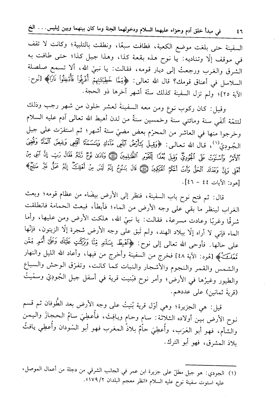 السفينة حتى بلغت موضع الكعبة ، فطافت سبعاً ، ونطقت بالتلبية ؛ وكانت لا تقف في موقف إلا وتناديه : يا نوح هذه بقعة كذا ، وهذا جبل كذا ؛ حتى طافت به الشرق والغرب ورجعت إلى ديار قومه ، فقالت : يا نبي الله ، ألا تسمع صلصلة السلاسل في أعناق قومك ؟ قال الله تعالى : " مما خطيئاتهم أغرقوا فادخلوا ناراً " ؛ ولم تزل السفينة كذلك ستة أشهر آخرها ذو الحجة . وقيل : كان ركوب نوح ومن معه السفينة لعشر خلون من شهر رجب وذلك لتتمة ألفي سنة ومائتي سنة وخمسين سنة من لدن أهبط الله تعالى آدم عليه السلام وخرجوا منها في العاشر من المحرم بعد مضي ستة أشهر ؛ ثم استقرت على جبل الجودي ، قال الله تعالى : " وقيل يا أرض ابلعي ماءك ويا سماء أقلعي وغيض الماء وقضي الأمر واستوت على الجودي وقيل بعداً للقوم الظالمين ، ونادى نوح ربه فقال رب إن ابني من أهلي وإن وعدك الحق وأنت أحكم الحاكمين ، قال يا نوح إنه ليس من أهلك إنه عمل غير صالح " .