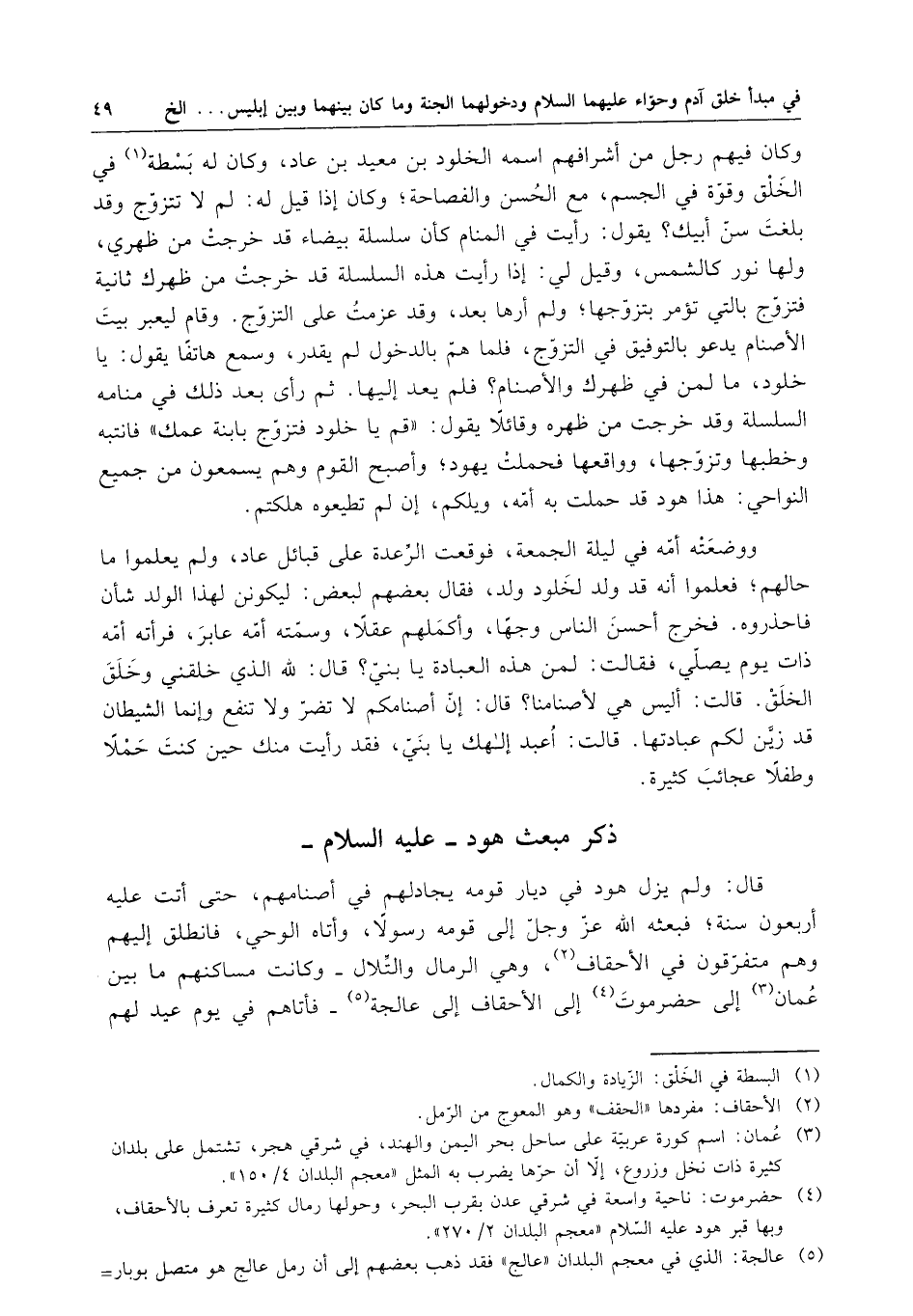 قال : ولم يزل هود في ديار قومه يجادلهم في أصنامهم ، حتى أتت عليه أربعون سنة ، فبعثه الله عز وجل إلى قومه رسولاً ، وأتاه الوحي ، فانطلق إليهم وهم متفرقون في الأحقاف ، وهي الرمال والتلال وكانت مساكنهم ما بين عمان إلى حضرموت إلى الأحقاف إلى عالجة فأتاهم في يوم عيد