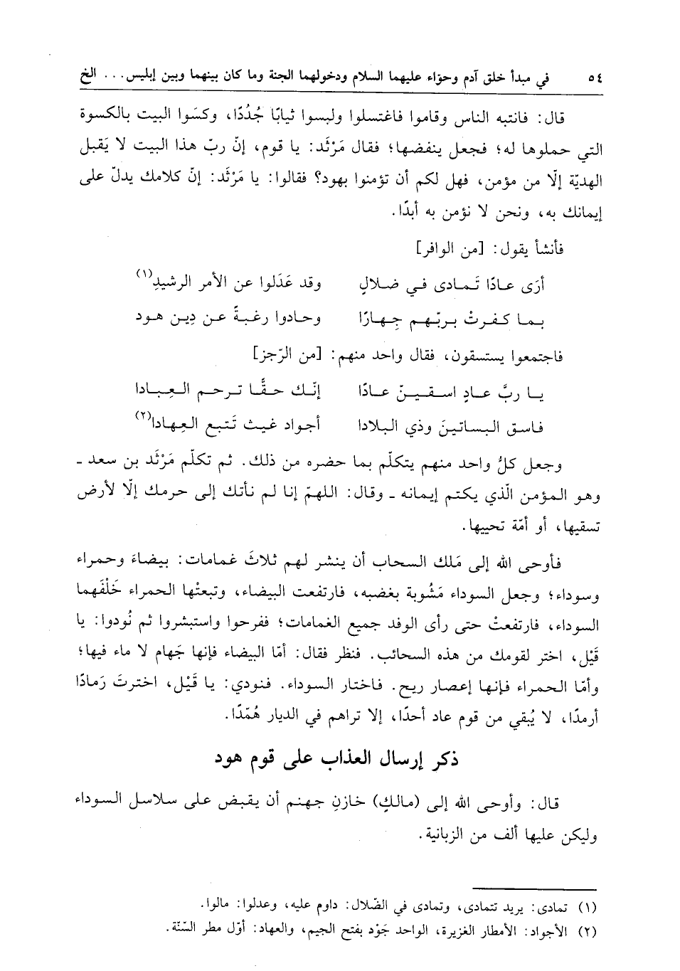 فأوحى الله إلى ملك السحاب أن ينشر لهم ثلاث غمامات : بيضاء وحمراء وسوداء ؛ وجعل السوداء مشوبة بغضبه ، فارتفعت البيضاء ، وتبعتها الحمراء خلفهما السوداء ، فارتفعت حتى رأى الوفد جميع الغمامات ؛ ففرحوا واستبشروا ثم نودوا : يا قيل ، اختر لقومك من هذه السحائب . فنظر فقال : أما البيضاء فإنها جهام لا ماء فيها ؛ وأما الحمراء فإنها إعصار ريح . فاختار السوداء . فنودي : يا قيل ، اخترت رماداً أرمداً ، لا يبقي من قوم عاد أحداً ، إلا تراهم في الديار همدا .
