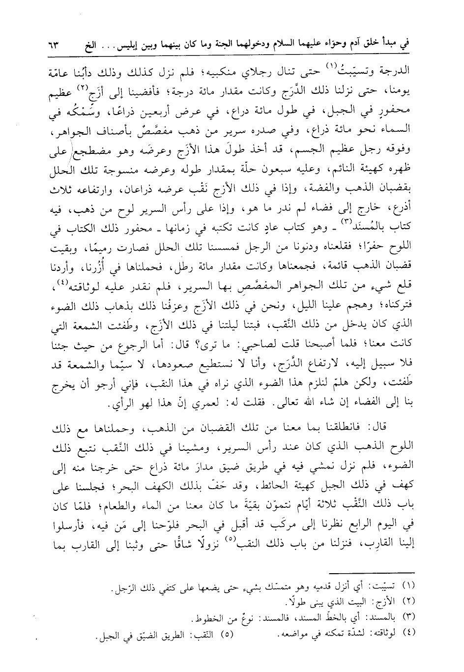 الدرجة وتسيبت حتى تنال رجلاي منكبيه ؛ فلم نزل كذلك وذلك دأبنا عامة يومنا ، حتى نزلنا ذلك الدرج وكانت مقدار مائة درجة ؛ فأفضينا إلى أزج عظيم محفور في الجبل ، في طول مائة ذراع ، في عرض أربعين ذراعاً ، وسمكه في السماء نحو مائة ذراع ، وفي صدره سرير من ذهب مفصص بأصناف الجواهر ، وفوقه رجل عظيم الجسم ، قد أخذ طول هذا الأزج وعرضه وهو مضطجع على ظهره كهيئة النائم ، وعليه سبعون حلة بمقدار طوله وعرضه منسوجة تلك الحال بقضبان الذهب والفضة ، وإذا في ذلك الأزج نقب عرضه ذراعان ، وارتفاعه ثلاث أذرع ، خار إلى فضاء لم ندر ما هو ، وإذا على رأس السرير لوح من ذهب ، فيه كتاب بالمسند - وهو كتاب عاد كانت تكتبه في زمانها - محفور ذلك الكتاب في اللوح حفراً ؛ فقلعناه ودنونا من الرجل فمسسنا تلك الحلل فصارت رميماً ، وبقيت قضبان الذهب قائمة ، فجمعناها وكانت مقدار مائة رطل ، فحملناها في أزرنا ، وأردنا قلع شيء من تلك الجواهر المفصص بها السرير ، فلم نقدر عليه لوثاقته ، فتركناه ؛ وهجم علينا الليل ، ونحن في ذلك الأزج وعرفنا ذلك بذهاب ذلك الضوء الذي كان يدخل من ذلك النقب ، فبتنا ليلتنا في ذلك الأزج ، وطفئت الشمعة التي كانت معنا ، فلما أصبحنا قلت لصاحبي : ما ترى ؟ قال : أما الرجوع من حيث جئنا فلا سبيل إليه ، لارتفاع الدرج ، وأنا لا نستطيع صعودها ، لا سيما والشمعة قد طفئت ، ولكن هلم لنلزم هذا الضوء الذي نراه في هذا النقب ، فإني أرجو أن يخرج بنا إلى الفضاء إن شاء الله تعالى . فقلت له : لعمري إن هذا لهو الرأي .