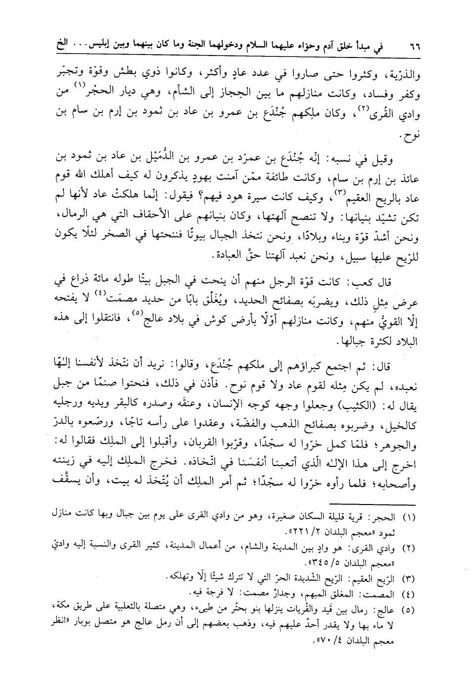 والذرية ، وكثروا حتى صاروا في عدد عاد وأكثر ، وكانوا ذوي بطش وقوة وتجبر وكفر وفساد ، وكانت منازلهم ما بين الحجاز إلى الشام ، وهي ديار الحجر من وادي القرى ، وكان ملكهم جندع بن عمرو بن عاد بن ثمود بن إرم بن سام ابن نوح .