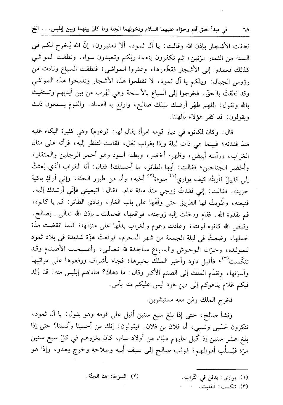 قال : وكان لكانوه في ديار قومه امرأة يقال لها : رعوم وهي كثيرة البكاء عليه منذ فقدته ؛ فبينما هي ذات ليلة وإذا بغراب نعق ، فقامت لتنظر إليه ، فرأته على مثال الغراب ، ورأسه أبيض ، وظهره أخضر ، وبطنه أسود وهو أحمر الرجلين والمنقار ، وأخضر الجناحين ؛ فقالت : أيها الطائر ، ما أحسنك فقال : أنا الغراب الذي بعثت إلى قابيل فأريته كيف يواري سوءة أخيه ، وأنا من طيور الجنة ، وإني أراك باكية حزينة . فقالت : إني فقدت زوجي منذ مائة عام . فقال : اتبعيني فإني أرشدك إليه . فتبعته ، وطويت لها الطريق حتى وقفها على باب الغار ، ونادى الطائر : قم يا كانوه ، قم بقدرة الله . فقام ودخلت إليه زوجته ، فواقعها ، فحملت بإذن الله تعالى بصالح . وقبض الله كانوه لوقته ؛ وعادت رعوم والغراب يدلها على منزلها ؛ فلما انقضت مدة حملها ، وضعت في ليلة الجمعة من شهر المحرم ، فوقعت هزة شديدة في بلاد تمود لمولده ، وخرت الوحوش والسباع ساجدة لله تعالى ، وأصبحت الأصنام وقد تنكست ؛ فأقبل داود وأخبر الملك بخبرها ؛ فجاء بأشراف ورفعوها على مراتبها وأسرتها ، وتقدم الملك إلى الصنم الأكبر وقال : ما دهاك ؟ فناداهم إبليس منه : قد ولد فيكم غلام يدعوكم إلى دين هود ليس عليكم منه بأس .