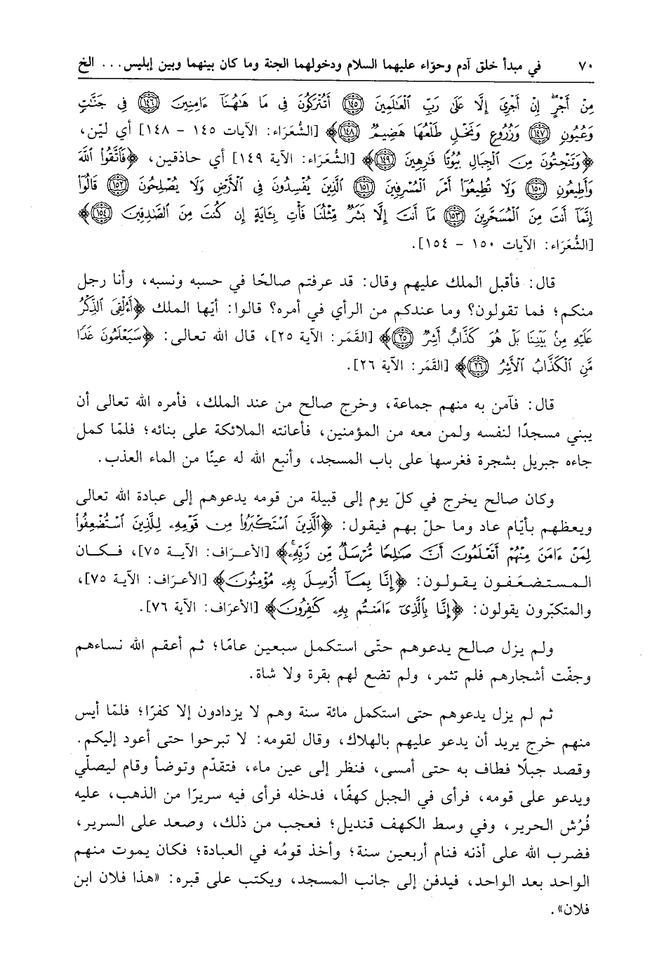 قال : فآمن به منهم جماعة ، وخرج صالح من عند الملك ، فأمره الله تعالى أن يبني مسجداً لنفسه ولمن معه من المؤمنين ، فأعانته الملائكة على بنائه ؛ فلما كمل جاءه جبريل بشجرة فغرسها على باب المسجد ، واتبع الله له عيناً من الماء العذب .