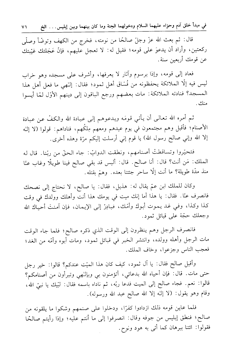 قال : ثم بعث الله عز وجل صالحاً من نومته ، فخرج من الكهف وتوضأ وصلى ركعتين ، وأراد أن يدعوا على قومه ؛ فقيل له : لا تعجل عليهم ، فإن عجلت غيبتك عن قومك أربعين سنة .