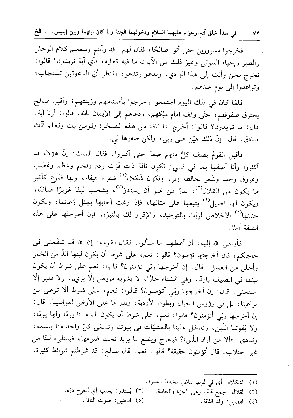 فأقبل القوم يصف كل منهم صفة حتى أكثروا . فقال الملك : إن هؤلاء قد أكثروا وأنا أصفها بما في قلبي : تكون ناقة ذات فرث ودم ولحم وعظم وعصب وعروق وجلد وشعر يخالطه وبر ، وتكون شكلاء شقراء هيفاء ، ولها ضرع كأكبر ما يكون من القلال ، يدر من غير أن يستدر ، يشخب لبناً غزيراً صافياً ، ويكون لها فصيل يتبعها على مثالها ، فإذا رغت أجابها بمثل رغائها ، ويكون حنينها الإخلاص لربك بالتوحيد ، والإقرار لك بالنبوة ، فإن أخرجتها على هذه الصفة آمنا . فأوحى الله إليه : أن أعطهم ما سألوا . فقال لقومه : إن الله قد شفعني في حاجتكم ، فإن أخرجتها تؤمنون ؟ قالوا : نعم ، على شرط أن يكون لبنها ألذ من الخمر وأحلى من العسل . قال : إن أخرجها ربي تؤمنون ؟ قالوا : نعم على شرط أن يكون لبنها في الصيف بارداً ، وفي الشتاء حاراً ، لا يشربه مريض إلا برئ ، ولا فقير إلا استغنى . قال : إن أخرجها ربي أتؤمنون ؟ قالوا : نعم ، على شرط ألا ترعى من مراعيا ، بل في رءوس الجبال وبطون الأودية ، وتذر ما على الأرض لمواشينا . قال : إن أخرجها ربي أتؤمنون ؟ قالوا : نعم ، على شرط أن يكون الماء لنا يوماً ولها يوماً ، ولا يفوتنا اللبن ، وتدخل علينا بالعشيات في بيوتنا وتسمى كل واحد منا باسمه ، وتنادي : " ألا من أراد اللبن " ؟ فيخرج ويضع ما يريد تحت ضرعها ، فيمثل لبناً من غير احتلاب ، قال أتؤمنون حقيقة ؟ قالوا : نعم . قال صالح : قد شرطتم شرائط كثيرة ،