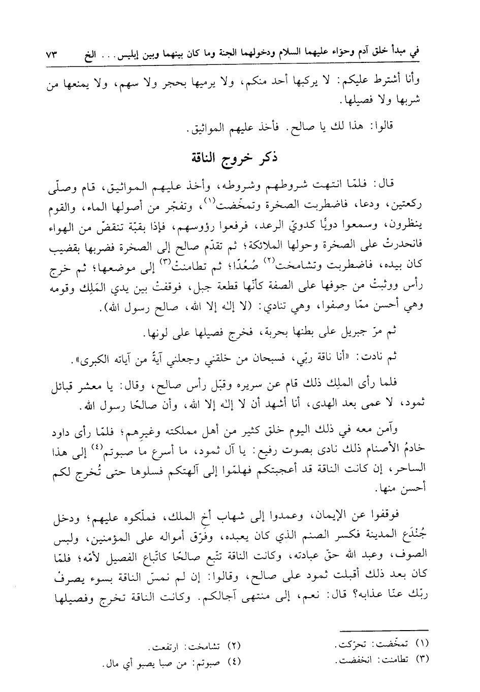 قال : فلما انتهت شروطهم وشروطه ، وأخذ عليهم المواثيق ، قام وصلى ركعتين ، ودعا ، فاضطربت الصخرة وتمخضت ، وتفجر من أصولها الماء ، والقوم ينظرون ، وسمعوا دوياً كدوي الرعد ، فرفعوا رءوسهم ، فإذا بقبة تنقض من الهواء فانحدرت على الصخرة وحولها الملائكة ؛ ثم تقدم صالح إلى الصخرة فضربها بقضيب كان بيده ، فاضطربت وتشامخت صعداً ، ثم تطامنت إلى موضعا ، ثم خرج رأس ووثبت من جوفها على الصفة كأنها قطعة جبلن فوقفت بين يدي الملك وقومه وهي أحسن مما وصفوا ، وهي تنادي : " لا إله إلا الله صالح رسول الله " .