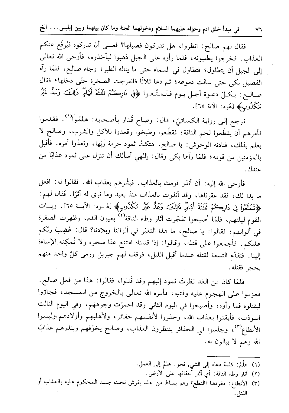 ترجع إلى رواية الكسائي ، قال : وصاح قدار بأصحابه : هلموا . فقدموا فأمرهم أن يقطعوا لحم الناقة ، فقطعوا وطبخوا وقعدوا للأكل والشرب ، وصالح لا يعلم بذلك ، فنادته الوحوش : يا صالح ، هتكت ثمود حرمة ربها ، وتعدوا أمره . فأقبل بالمؤمنين من قومه ، فلما رآها بكى وقال : إلهي أسألك أن تنزل على ثمود عذاباً من عندك .
