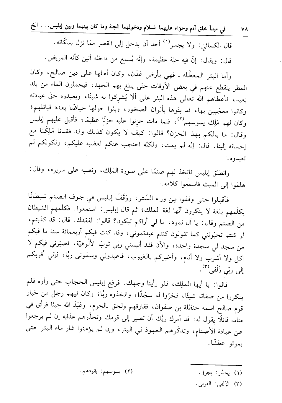 فأقبلوا حتى وقفوا من وراء الستر ، ووقف إبليس في جوف الصنم شيطاناً يكلمهم بلغة لا ينكرون أنها لغة الملك ، ثم قال إبليس : استمعوا . فكلمهم الشيطان من الصنم وقال : يا آل ثمود ، مالي أراكم تبكون ؟ قالوا : لفقدك . قال : قد كذبتم ، لو كنتم تحبوني كما تقولون كنتم عبدتموني ، وقد كنت فيكم أربعمائة سنة ما فيكم من سجد لي سجدة واحدة ، والآن فقد ألبسني ربي ثوب الألوهية ، فصيرني فيكم لا آكل ولا أشرب ولا أنام ، وأخبركم بالغيوب ، فاعبدوني وسموني رباً ، فإني أقربكم إلى ربي زلفى .