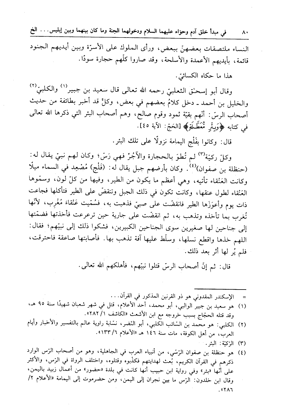 وقال أبو إسحاق الثعلبي رحمه الله قال سعيد بن جبير والكلبي والخليل بن أحمد دخل كلام بعضهم في بعض ، وكل قد أخبر بطائفة من حديث أصحاب الرس : أنهم بقية ثمود وقوم صالح ، وهم أصحاب البئر التي ذكرها الله تعالى في كتابه " وبئر معطلة " .