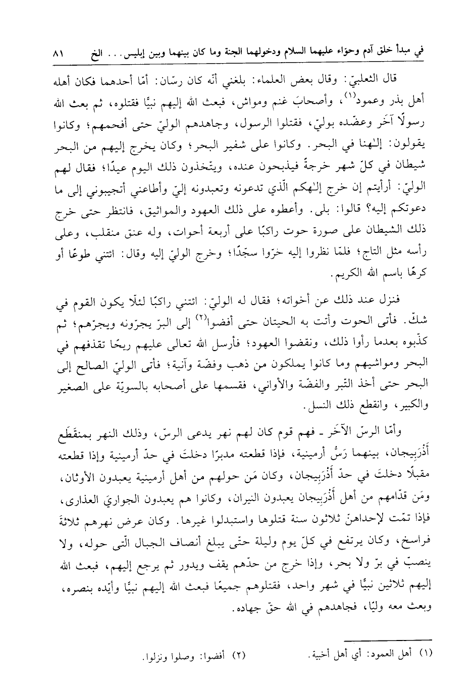 فنزل عند ذلك عن أخواته ، فقال له الولي : ائتني راكباً لئلا يكون القوم في شك . فأتى الحوت وأتت به الحيتان حتى أفضوا إلى البر يجرونه ويجرهم ، ثم كذبوه بعد ما رأوا ذلك ، ونقضوا العهود ، فأرسل الله تعالى عليهم ريحاً تقذفهم في البحر ومواشيهم وما كانوا يملكون من ذهب وفضة وآنية ؛ فأتى الولي الصالح إلى البحر حتى أخذ التبر والفضة والأواني ، فقسمها على أصحابه بالسوية على الصغير والكبير ، وانقطع ذلك النسل . وأما الرس الآخر فهم قوم كان لهم نهر يدعى الرس ، وذلك النهر بمنقطع أذربيجان ، بينهما رس أرمينة ، فإذا قطعنه مدبراً دخلت في حد أرمينية وإذا قطعته مقبلاً دخلت في حد أذربيجان ، وكان من حولهم من أهل أرمينية يعبدون الأوثان ، ومن قدامهم من أهل أذربيجان يعبدون النيران ، وكانوا هم يعبدون الجواري العذارى ، فإذا تمت لإحداهن ثلاثون سنة قتلوها واستبدلوا غيرها . وكان عرض نهرهم ثلاثة فراسخ ، وكان يرتفع في كل يوم وليلة حتى يبلغ أنصاف الجبال التي حوله ، ولا ينصب في بر ولا بحر ، وإذا خرج من حدهم يقف ويدور ثم يرجع إليهم فبعث الله إليهم ثلاثين نبياً في شهر واحد ، فقتلوهم جميعاً فبعث الله إليهم نبياً وأيده بنصره ، وبعث معه ولياً ، فجاهدهم في الله حق جهاده .