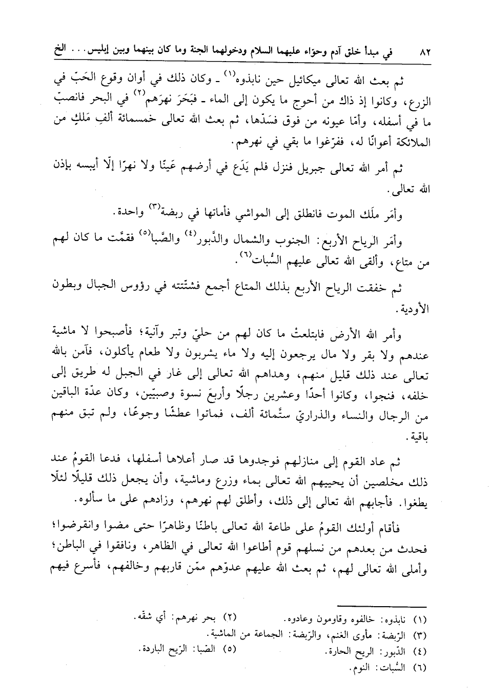 ثم بعث الله تعالى ميكائيل حين نابذوه - وكان ذلك في أول وقوع الحب في الزرع ، وكانوا إذ ذاك من أحوج ما يكون إلى الماء - فبحر نهرهم في البحر فانصب ما في أسفله ، وأما عيونه من فوق فسدها ، ثم بعث الله تعالى خمسمائة ألف ملك من الملائكة أعواناً له ، ففرغوا ما بقي في نهرهم .