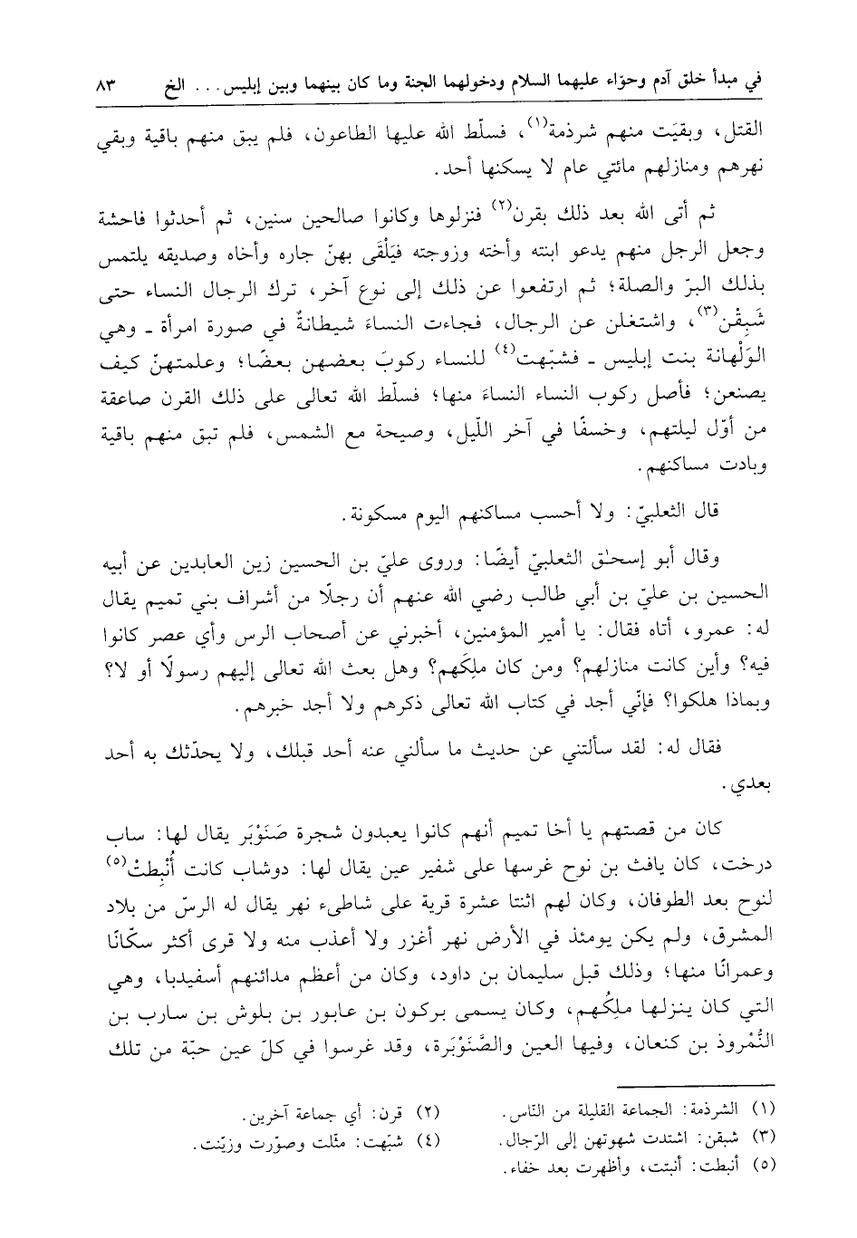 وقال أبو إسحاق الثعلبي أيضاً : وروى علي بن الحسين زين العابدين عن أبيه الحسين بن علي بن أبي طالب رضي الله عنهم أن رجلاً من أشراف بني تميم يقال له : عمرو ، أتاه فقال : يا أمير المؤمنين ، أخبرني عن أصحاب الرس وأي عصر كانوا فيه ؟ وأين كانت منازلهم ؟ ومن كان ملكهم ؟ وهل بعث الله تعالى إليهم رسولاً أو لا ؟ وبماذا هلكوا ؟ فإني أجد في كتاب الله تعالى ذكرهم ولا أجد خبرهم .