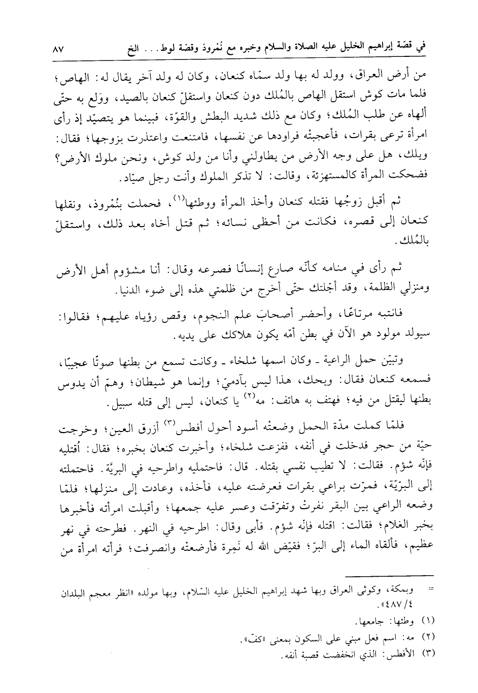 من أرض العراق ، وولد له بها ولد سماه كنعان ، وكان ولد آخر يقال له : الهاص ؛ فلما مات كوش استقل الهاص بالملك دون كنعان واستقل كنعان بالصيد ، وولع به حتى ألهاه عن طلب الملك ، وكان مع ذلك شديد البطش والقوة ، فبينما هو يتصيد إذ رأى امرأة ترعى بقرات ، فأعجبته فراودها عن نفسها ، فامتنعت واعتذرت بزوجها ؛ فقال : ويلك ، هل على وجه الأرض من يطاولني وأما من ولد كوش ، ونحن ملوك الأرض ؟ فضحكت المرأة كالمستهزئة ، وقالت : لا تذكر الملوك وأنت رجل صياد .