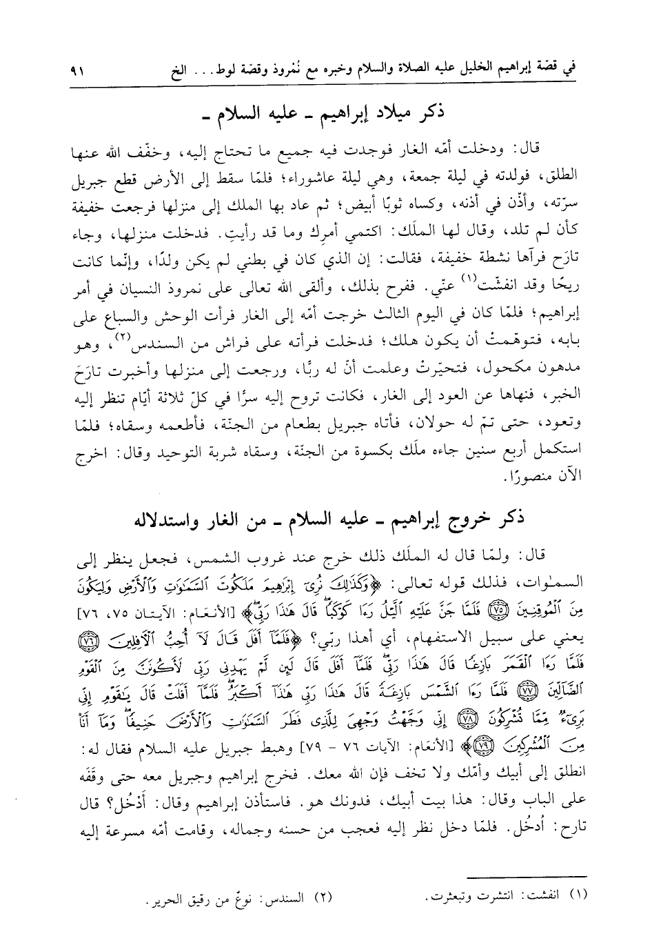 قال : ودخلت أمه الغار فوجدت فيه جميع ما تحتاج إليه ، وخفف الله عنها الطلق ، فولدته في ليلة جمعة ، وهي ليلة عاشوراء ؛ فلما سقط إلى الأرض قطع جبريل سرته ، وأذن في أذنه ، وكساه ثوباً أبيض ؛ ثم عاد بها إلى منزلها فرجعت خفيفة كأن لم تلد ، وقال لها الملك : اكتمي أمرك وما قد رأيت . فدخلت منزلها ، وجاء تارح فرآها نشيطة خفيفة ، فقالت : إن الذي كان في بطني لم يكن ولداً ، وإنما كانت ريحاً وقد انشقت عني . ففرح بذلك ، وألقى الله تعالى على نمروذ النسيان في أمر إبراهيم ؛ فلما كان اليوم الخامس خرجت أمه إلى الغار فرأت الوحش والسباع على بابه ، فتوهمت أن يكون هلك ؛ فدخلت فرأته على فراش من السندس ، وهو مدهون مكحول ، فتحيرت وعلمت أن له رباً ، ورجعت إلى منزلها وأخبرت تارح الخبر ، فنهاها عن العود إلى الغار ، فكانت تروح إليه سراً في كل ثلاثة أيام تنظر إليه وتعود ، حتى تم له حولان ، فأتاه جبريل بطعام من الجنة ، فأطعمه وسقاه ؛ فلما استكمل أربع سنين جاءه ملك بكسوة من الجنة ، وسقاه شربة التوحيد وقال : اخرج الآن منصوراً .