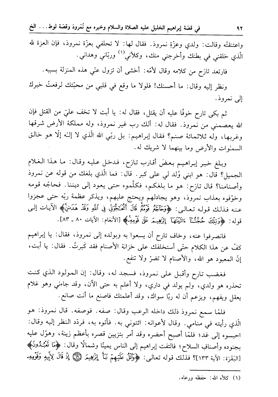 واعتنقته وقالت : ولدي وعزة نمروذ . فقال لها : لا تحلفي بعزة نمروذ ، فإن العزة لله الذي خلقني في بطنك وأخرجني منك ، وكلأني ورباني وهداني .