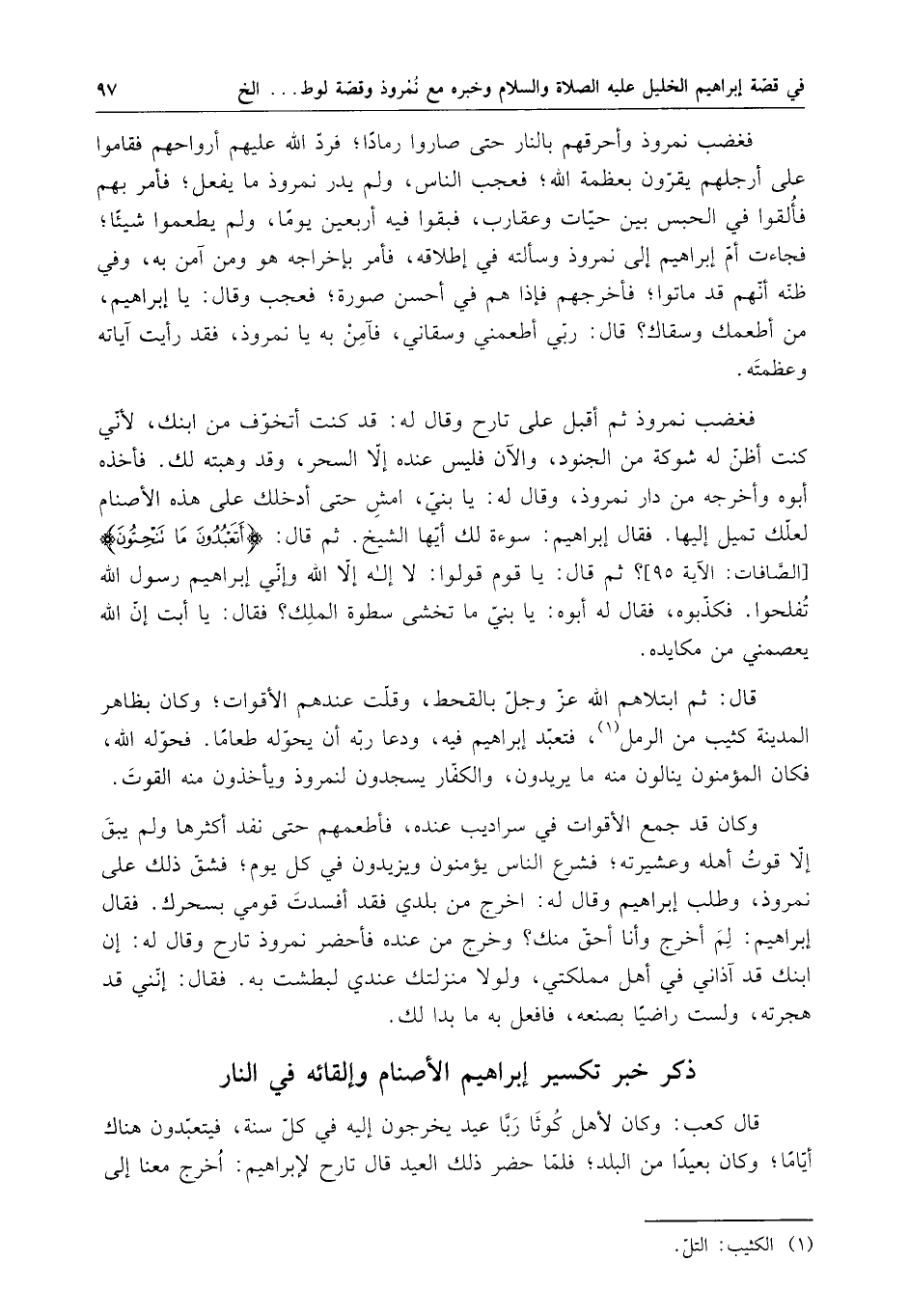 فغضب نمروذ ثم أقبل على تارح وقال له : قد كنت أتخوف من ابنك ، لأني كنت أظن له شوكة من الجنود ، والآن فليس عنده إلا السحر ، وقد وهبته لك . فأخذه أبوه وأخرج من دار نمروذ ، وقال له : يا بني ، امش حتى أدخلك عبادة هذه الأصنام لعلك تميل إليها . فقال إبراهيم : سوءة لك أيها الشيخ . ثم قال : " أتعبدون ما تنحتون ؟ " ثم قال : يا قوم قولوا : لا إله إلا الله وإني إبراهيم رسول الله تفلحوا . فكذبوه ، فقال له أبوه : يا بني ما تخشى سطوة الملك . فقال : يا أبت إن الله يعصمني من مكايده .