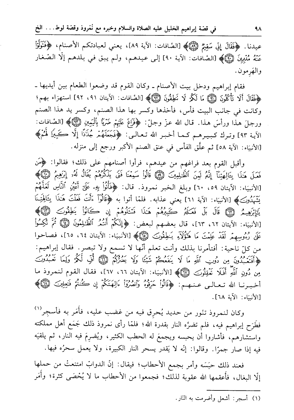 فقام إبراهيم ودخل بيت الأصنام - وكان القوم قد وضعوا الطعام بين أيديها - " فقال ألا تأكلون ، مالكم لا تنطقون " استهزاء بهم ، وكانت في جانب البيت فأس ، فأخذها وكسر بها هذا الصنم ، وكسر يد هذا الصنم ورجل هذا ورأس هذا . قال الله عز وجل : " فراغ عليهم ضرباً باليمين " وترك كبيرهم كما أخبر الله تعالى : " فجعلهم جذاذاً إلا كبير لهم " ثم علق الفأس في عنق الصنم الأكبر ورجع إلى منزله . وأقبل القوم بعد فراغهم من عيدهم ، فرأوا أصنامهم على ذلك ؛ فقالوا : " من فعل هذا بآلهتنا إنه لمن الظالمين ، قالوا سمعنا فتى يذكرهم يقال له إبراهيم " وبلغ الخبر نمروذ . قال : " فأتوا به على أعين الناس لعلهم يشهدون " يعني عذابه . فلما أتوا به " قالوا ءأنت فعلت هذا بآلهتنا يا إبراهيم ، قال بل فعله كبيرهم هذا فاسألوهم إن كانوا ينطقون " قال بعضهم لبعض : " إنكم أنتم الظالمون ، ثم نكسوا على رؤوسهم لقد علمت ما هؤلاء ينطقون " فصاحوا من كل ناحية : أفتأمرنا بذلك وأنت تعلم أنها لا تسمع ولا تبصر . فقال إبراهيم : " أفتعبدون من دون الله ما لا ينفعكم شيئاً ولا يضركم أف لكم ولما تعبدون من دون الله أفلا تعقلون " فقال القوم لنمروذ ما أخبرنا الله تعالى عنهم : " قالوا حرقوه وانصروا آلهتكم إن كنتم فاعلين " .