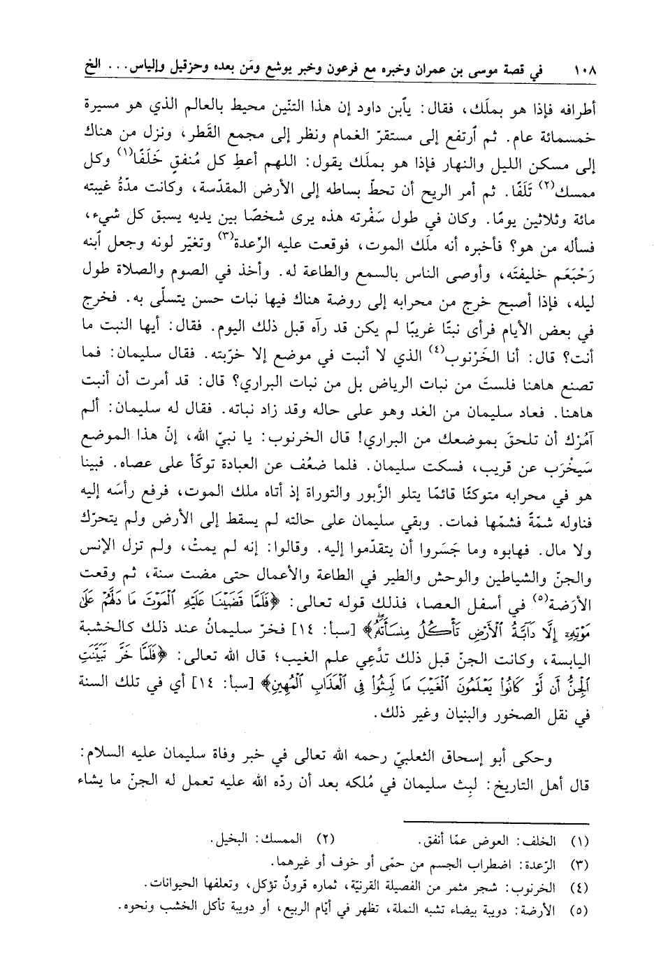 أطرافه فإذا هو بملك ، فقال : يا بن داود إن هذا التنين محيط بالعالم الذي هو مسيرة خمسمائة عام . ثم ارتفع إلى مستقر الغمام ونظر إلى مجمع القطر ، ونزل من هناك إلى مسكن الليل والنهار فإذا هو بملك يقول : اللهم أعط كل منفق خلقاً وكل ممسك تلفاً . ثم أمر الريح أن تحط بساطه إلى الأرض المقدسة ، وكانت مدة غيبته مائة وثلاثين يوماً . وكان في طول سفرته هذه يرى شخصاً بين يديه يسبق كل شيء ، فسأله من هو ؟ فأخبره أنه ملك الموت ، فوقعت عليه الرعدة وتغير لونه وجعل ابنه رحبعم خليفته ، وأوصى الناس بالسمع والطاعة له . وأخذ في الصوم والصلاة طول ليله ، فإذا أصبح خرج من محرابه إلى روضة هناك فيها نبات حسن يتسلى به . فخرج في بعض الأيام فرأى نبتاً غريباً لم يكن قد رآه قبل ذلك اليوم . فقال : أيها النبت ما أنت ؟ قال : أنا الخرنوب الذي لا أنبت في موضع إلى خربته . فقال : قد أمرت أن أنبت هاهنا . فعاد سليمان من الغد وهو على حاله وقد زاد نباته . فقال له سليمان : ألم آمرك أن تلحق بموضعك من البراري . قال الخرنوب : يا نبي الله ، إن هذا الموضع سيخرب عن قريب ، فسكت سليمان . فلما ضعف عن العبادة توكأ على عصاه . فبينا هو في محرابه متوكئاً قائماً يتلو الزبور والتوراة إذ أتاه ملك الموت ، فرفع رأسه إليه فناوله شمة فشمها فمات . وبقي سليمان على حالته لم يسقط إلى الأرض ولم يتحرك ولا مال . فهابوه وما جسروا أن يتقدموا إليه . وقالوا : إنه لم يمت ، ولم تزل الإنس والجن والشياطين والوحش والطير في الطاعة والأعمال حتى مضت سنة ، ثم وقعت الأرضة في أسفل العصا ، فذلك قوله تعالى : " فلما قضينا عليه الموت ما دلهم على موته إلا دابة الأرض تأكل منسأته " فخر سليمان عند ذلك كالخشبة اليابسة ، وكانت الجن قبل ذلك تدعي علم الغيب ؛ قال الله تعالى : " فلما خر تبينت الجن أن لو كانوا يعلمون الغيب ما لبثوا في العذاب المهين " أي في تلك السنة في نقل الصخور والبنيان وغير ذلك .