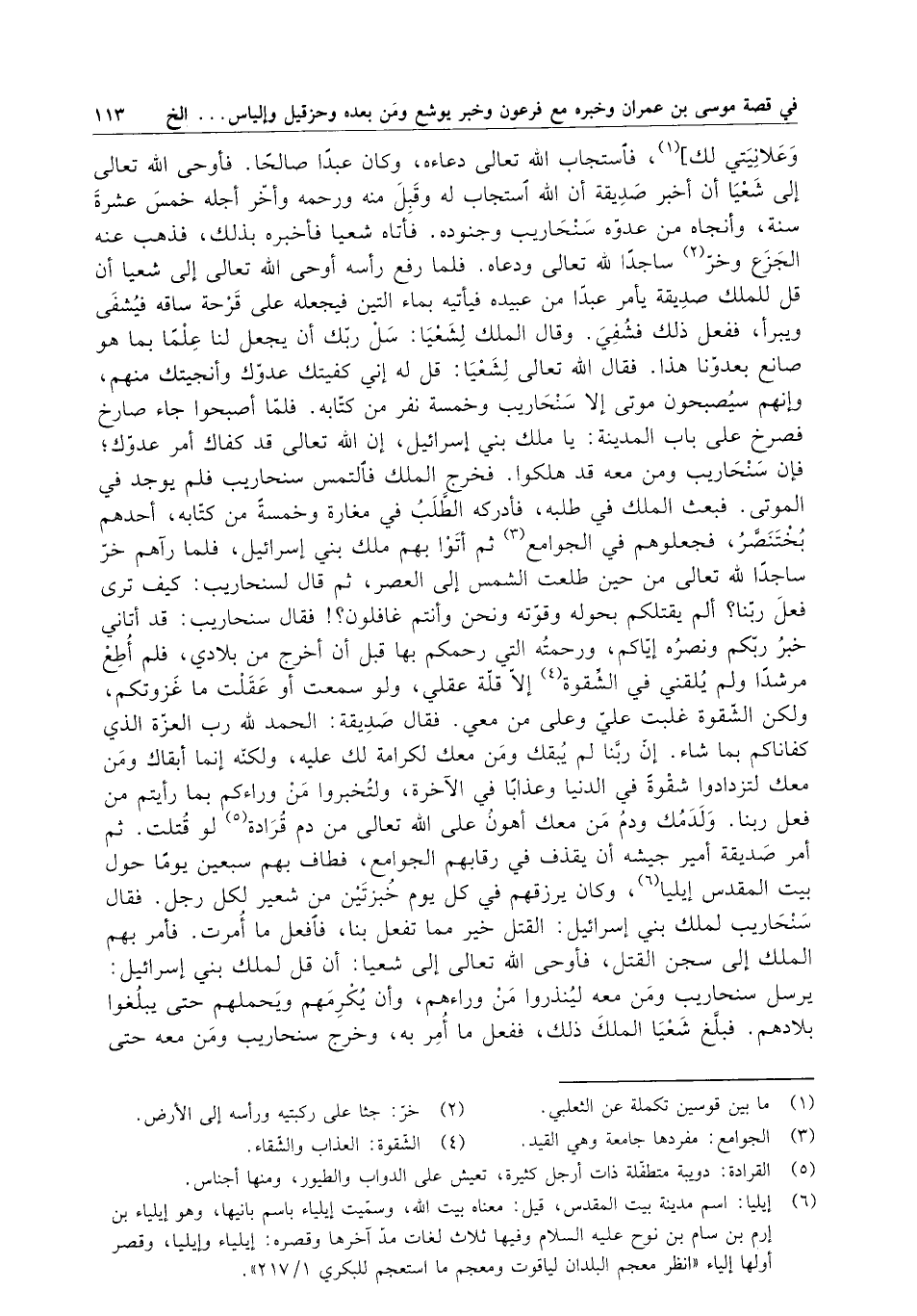 وعلانيتي لك " ، فاستجاب الله تعالى دعاءه ، وكان عبداً صالحاً . فأوحى الله تعالى إلى شعيا أن أخبر صديقة أن الله استجاب له وقبل منه ورحمه وأخر أجله خمس عشرة سنة ، وأنجاه من عدوه سنحاريب وجنوده . فلما رفع رأسه أوحى الله تعالى إلى شعيا أن قل للملك صديقة يأمر عبداً من عبيده فيأتيه بماء التين فيجعله على قرحة ساقه فيشفي ويبرأ ، ففعل ذلك فشفي . وقال الملك لشعيا : سل ربك أن يجعل لنا علماً بما هو صانع بعدونا هذا . فقال الله تعالى لشعيا : قل له إني كفيتك عدوك وأنجيتك منهم ، وإنهم سيصبحون موتى إلا سنحاريب وخمسة نفر من كتابه . فلما أصحوا جاء صارخ فصرخ على باب المدينة : يا ملك بني إسرائيل ، إن الله تعالى قد كفاك أمر عدوك ؛ فإن سنحاريب ومن معه قد هلكوا . فخرج الملك فالتمس سنحاريب فلم يوجد في الموتى . فبعث الملك في طلبه ، فأدركه الطلب في مغارة وخمسة من كتابه ، أحدهم بختنصر ، فجعلوهم في الجوامع ثم أتوا بهم ملك بني إسرائيل ، فلما رآهم خر ساجداً لله تعالى من حين طلعت الشمس إلى العصر ، ثم قال لسنحاريب : كيف ترى فعل ربنا ؟ ألم يقتلكم بحوله وقوته ونحن وأنتم غافلون ؟ فقال سنحاريب : قد أتاني خبر ربكم ونصره إياكم ، ورحمته التي رحمكم بها قبل أن أخرج من بلادي ، فلم أطع مرشداً ولم يلقني في الشقوة إلا قلة عقلي ، ولو سمعت أو عقلت ما غزوتكم ، ولكن الشقوة غلبت علي وعلى من معي . فقال صديقة : الحمد لله رب العزة الذي كفاناكم بما شاء . إن ربنا لم يبقك ومن معك لكرامة لك عليه ، ولكنه إنما أبقاك ومن معك لتزدادوا شقوة في الدنيا وعذاباً في الآخرة ، ولتخبروا من وراءكم بما رأيتم من فعل ربنا . ولدمك ودم من معك أهون على الله تعالى من دم قرادة لو قتلت . ثم أمر صديقة أمير جيشه أن يقذف في رقابهم الجوامع ، فطاف بهم سبعين يوماً حول بيت المقدس وإيليا ، وكان يرزقهم في كل يوم خبزتين من شعير لكل رجل . فقال سنحاريب لملك بني إسرائيل : القتل خير مما تفعل بنا ، فافعل ما أمرت . فأمر بهم الملك إلى سجن القتل ، فأوحى الله تعالى إلى شعيا : أن قل لملك بني إسرائيل : يرسل سنحاريب ومن معه لينذروا من وراءهم ، وأن يكرمهم ويحملهم حتى يبلغوا بلادهم . فبلغ شعيا الملك ذلك ، ففعل ما أمر به ، وخرج سنحاريب ومن معه حتى