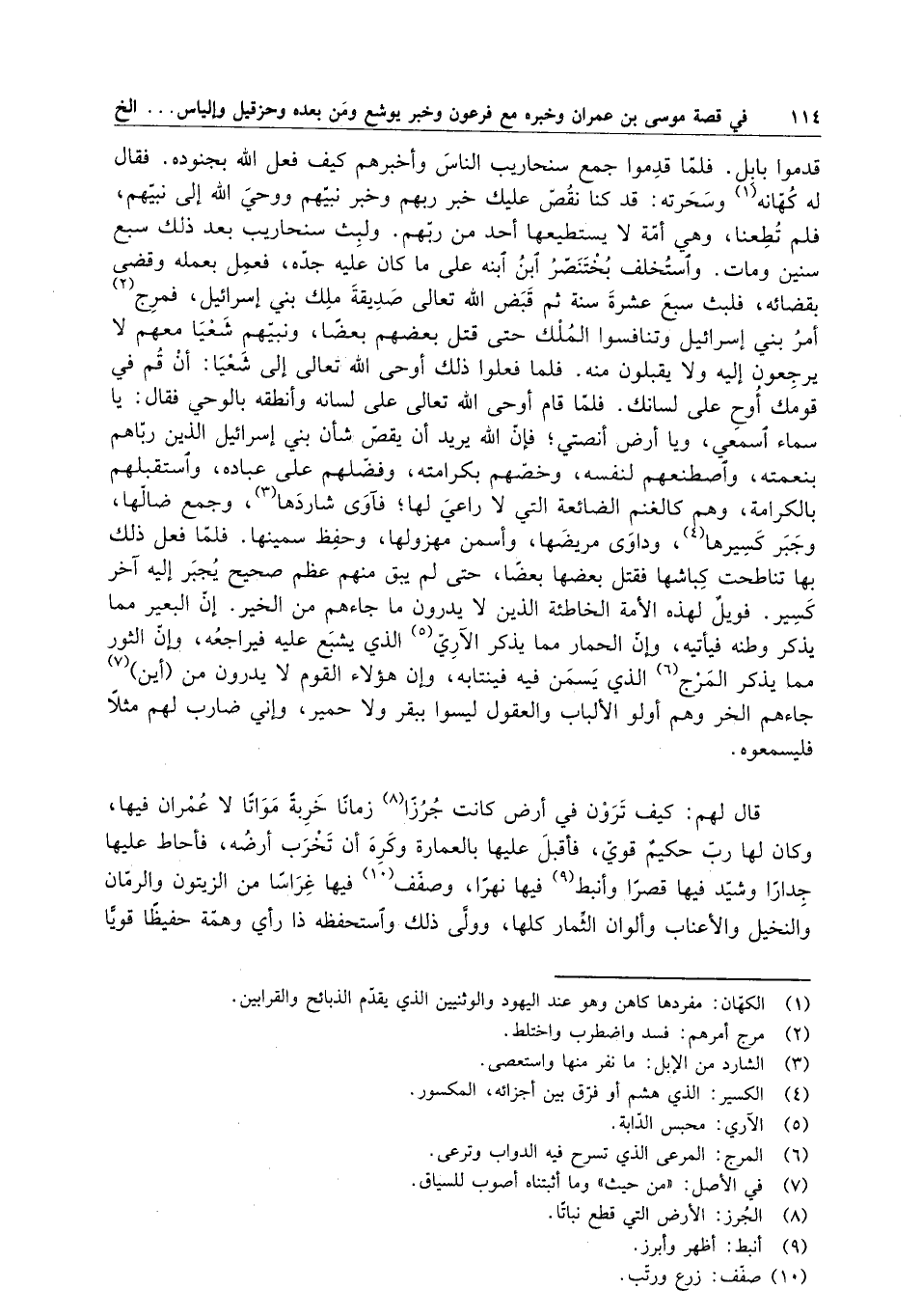 قدموا بابل . فلما قدموا جمع سنحاريب الناس وأخبرهم كيف فعل الله بجنوده . فقال له كهانه وسحرته : قد كنا نقص عليك خبر ربهم وخبر نبيهم ووحي الله إلى نبيهم ، فلم تطعنا ، وهي أمة لا يستطيعها أحد من ربهم . ولبث سنحاريب بعد ذلك سبع سنين ومات . واستخلف بختنصر ابن ابنه على ما كان عليه جده ، فعمل بعمله وقضى بقضائه ، فلبث سبع عشرة سنة ثم قبض الله تعالى صديقة ملك بني إسرائيل ، فمرج أمر بني إسرائيل وتنافسوا الملك حتى قتل بعضهم بعضاً ، ونبيهم شعيا معهم لا يرجعون إليه ولا يقبلون منه . فلما فعلوا ذلك أوحى الله تعالى إلى شعيا : أن ثم في قومك أوح على لسانك . فلما قام أوحى الله تعالى على لسانه وأنطقه بالوحي فقال : يا سماء اسمعي ، ويا أرض أنصتي ؛ فإن الله يريد أن يقص شأن بني إسرائيل الذين رباهم بنعمته ، واصطنعهم لنفسه ، وخصهم بكرامته ، وفضلهم على عباده ، واستقبلهم بالكرامة ، وهم كالغنم الضائعة التي لا راعي لها ؛ لآوى شاردها ، وجمع ضالها ، وجبر كسيرها ، وداوى مريضها ، وأسمن مهزولها ، وحفظ سمينها . فلما فعل ذلك بها تناطحت كباشها فقتل بعضها بعضاً ، حتى لم يبق منهم عظم صحيح يجبر إليه آخر كسير . فويل لهذه الأمة الخاطئة الذين لا يدرون ما جاءهم من الخير . إن البعير مما يذكر وطنه فيأتيه ، وإن الحمار مما يذكر الآرى الذي يشبع عليه فيراجعه ، وإن الثور مما يذكر المرج الذي يسمن فيه فينتابه ، وإن هؤلاء القوم لا يدرون من أين جاءهم الخير وهم ألو الألباب والعقول ليسوا ببقر ولا حمير ، وإني ضارب لهم مثلاً فليسمعوه . افسوا الملك حتى قتل بعضهم بعضاً ، ونبيهم شعيا معهم لا يرجعون إليه ولا يقبلون منه . فلما فعلوا ذلك أوحى الله تعالى إلى شعيا : أن ثم في قومك أوح على لسانك . فلما قام أوحى الله تعالى على لسانه وأنطقه بالوحي فقال : يا سماء اسمعي ، ويا أرض أنصتي ؛ فإن الله يريد أن يقص شأن بني إسرائيل الذين رباهم بنعمته ، واصطنعهم لنفسه ، وخصهم بكرامته ، وفضلهم على عباده ، واستقبلهم بالكرامة ، وهم كالغنم الضائعة التي لا راعي لها ؛ لآوى شاردها ، وجمع ضالها ، وجبر كسيرها ، وداوى مريضها ، وأسمن مهزولها ، وحفظ سمينها . فلما فعل ذلك بها تناطحت كباشها فقتل بعضها بعضاً ، حتى لم يبق منهم عظم صحيح يجبر إليه آخر كسير . فويل لهذه الأمة الخاطئة الذين لا يدرون ما جاءهم من الخير . إن البعير مما يذكر وطنه فيأتيه ، وإن الحمار مما يذكر الآرى الذي يشبع عليه فيراجعه ، وإن الثور مما يذكر المرج الذي يسمن فيه فينتابه ، وإن هؤلاء القوم لا يدرون من أين جاءهم الخير وهم ألو الألباب والعقول ليسوا ببقر ولا حمير ، وإني ضارب لهم مثلاً فليسمعوه . قل هلم : كيف ترون في أرض كانت جرزاً زماناً خربةً مواتاً لا عمران فيها ، وكان لها رب حكيم قوي ، فأقبل عليها بالعمارة وكره أن تخرب أرضه ، فأحاط عليها جداراً وشيد فيها قصراً وأنبط فيها نهراً ، وصفف فيها غراساً من الزيتون والرمان والنخيل والأعناب وألوان الثمار كلها ، وولي ذلك واستحفظه ذا رأي وهمة حفيظاً قوياً