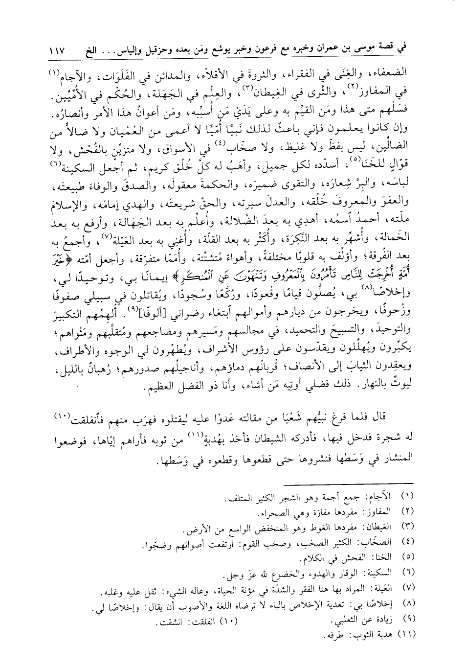 الضعفاء ، والغنى في الفقراء ، والثروة في الأفلاء ، والمدائن في الفلوات ، والآجام في المفاوز ، والثرى في الغيطان ، والعلم في الجهلة ، والحكم في الأميين . فسلهم متى هذا ومن القيم به وعلى يدي من أسببه ، ومن أعوان هذا الأمر وأنصاره . وإن كانوا يعلمون فإني باعث لذلك نبياً أميا لا أعمى من العميان ولا ضالاً من الضالين ، ليس بفظ ولا غليظ ، ولا صاحب في الأسواق ، ولا متزين بالفحش ، ولا قوال للخنا ، أسدده لكل جميل ، وأهب له كل خلق كريم ، ثم أجعل السكينة لباسه ، والبر شعاره ، والتقوى ضميره ، والحكمة معقوله ، والصدق والوفاء طبيعته ، والعفو والمعروف خلقه ، والعدل سيرته ، والحق شريعته ، والهدى إمامه ، والإسلام ملته ، أحمد اسمه ، أهدي به بعد الضلالة ، وأعلم به بعد الجهالة ، وأرفع به بعد الخمالة ، وأشهر به بعد النكرة ، وأكثر به بعد القلة ، وأغني به بعد العيلة ، وأجمع به بعد الفرقة ؛ وأؤلف به قلوباً مختلفة ، وأهواء متشتتة ، وأمما متفرقة ، وأجعل أمته خير أمة أخرجت للناس ، يأمرون بالمعروف وينهون عن المنكر ، إيماناً بي ، وتوحيداً لي ، وإخلاصاً بي ، يصلون قياماً وقعوداً ، وركعاً وسجوداً ، ويقاتلون في سبيلي صفوفاً وزحوفاً ، ويخرجون من ديارهم وأموالهم ابتغاء رضواني ألوفاً . ألهمهم التكبير والتوحيد ، والتسبيح والتحميد ، في مجالسهم ومسيرهم ومضاجعهم ومتقلبهم ومثواهم ؛ يكبرون ويهللون ويقدسون على رءوس الأشراف ، ويطهرون لي الوجوه والأطراف ، ويعقدون الثياب إلى الأنصاف ؛ قربانهم دماؤهم ، وأنا جيلهم صدورهم ؛ رهبان بالليل ، ولبث بالنهار . ذلك فضلي أوتيه من أشاء ، وأنا ذو الفضل العظيم .