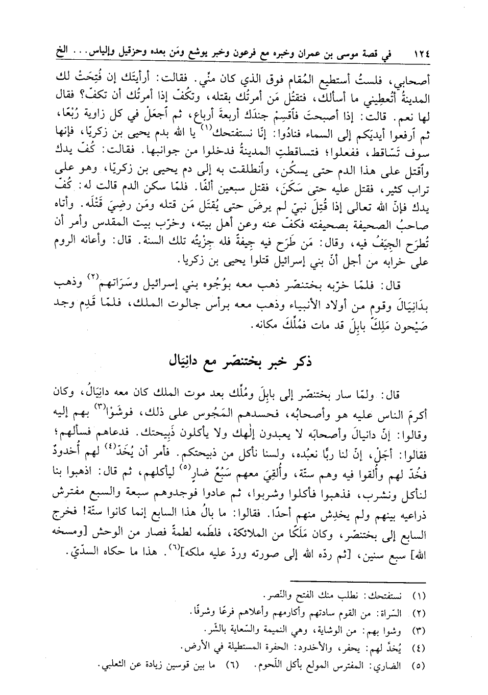 أصحابي ، فلست أستطيع المقام فوق الذي كان مني . فقالت : أرأيتك إن فتحت لك المدينة أتعطيني ما أسألك ، إذا أصبحت فاقسم جندك أربعة أرباع ، ثم اجعل في كل زاوية ربعاً ، ثم ارفعوا أيديكم إلى السماء فنادوا : إنا نستفتحك يا الله بدم يحيى بن زكريا ، فإنها سوف تساقط ، ففعلوا ؛ فتساقطت المدينة فدخلوا من جوانبها . فقالت : كف يدك واقتل على هذا الدم حتى يسكن ، وانطلقت به إلى دم يحيى بن زكريا ، وهو على تراب كثير ، فقتل عليه حتى سكن ، فقتل سبعين ألفاً . فلما سكن الدم قالت له : كف يدك فإن الله تعالى إذا قتل نبي لم يرض حتى يقتل من قتله ومن رضي قتله . وأتاه . صاحب الصحيفة بصحيفته فكف عنه وعن أهل بيته ، وخرب بيت المقدس وأمر أن تطرح الجيف فيه ، وقال : من طرح فيه جيفة فله جزيته تلك السنة . قال : وأعانه الروم على خرابه من أجل أن بني إسرائيل قتلوا يحيى بن زكريا .