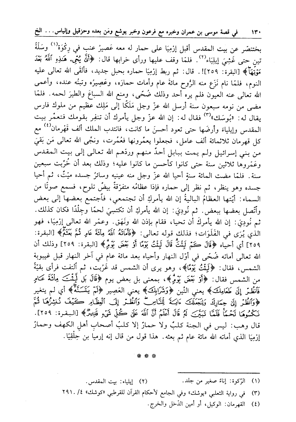 بختنصر عن بيت المقدس أقبل إرميا على حمال له معه عصير عنب في ركوة وسلة تين حتى غشى إيلياء . فلما وقف عليها ورأى خرابها قال : " أنى يحيي هذه الله بعد موتها " . قال : ثم ربط إرميا حماره بحبل جديد ، فألقى الله تعالى عليه النوم ، فلما نام نزع منه الروح مائة عام وأمات حماره ، وعصيره وتينه عنده ، وأعمى الله تعالى عنه العيون فلم يره أحد وذلك ضحى ، ومنع الله السباع والطير لحمه . فلما مضى من نومه سبعون سنة أرسل الله عز وجل ملكاً إلى ملك عظيم من ملوك فارس يقال له : بوسك فقال له : إن الله عز وجل يأمرك أن تنفر بقومك فتعمر بيت المقدس وإيلياء وأرضها حتى تعود أحسن ما كانت ، فانتدب الملك ألف قهرمان مع كل قهرمان ثلاثمائة ألف عامل ، فجعلوا يعمرونها فعمرت ، ونجى الله تعالى من بقي من بني إسرائيل ولم يمت ببابل أحد منهم وردهم الله تعالى إلى بيت المقدس وعمروها ثلاثين سنة حتى كانوا كأحسن ما كانوا عليه ؛ وذلك بعد أن خربت سبعين سنة . فلما مضت المائة سنة أحيا الله عز وجل منه عينيه وسائر جسده ميت ، ثم أحيا جسده وهو ينظر ، ثم نظر إلى حماره فإذا عظامه متفرقة بيض تلوح ، فسمع صوتاً من السماء : أيتها العظام البالية إن الله يأمرك أن تجتمعي ، فاجتمع بعضها إلى بعض واتصل بعضها ببعض ، ثم نودي : إن الله يأمرك أن تكتسي لحماً وجلداً فكان كذلك . ثم نودي : إن الله يأمرك أن تحيا ، فقام بإذن الله ونهق . وعمر الله تعالى إرميا ، فهوا الذي يرى في الفلوات ؛ فذلك قوله تعالى : " فأماته الله مائة عام ثم بعثه " أي أحياه " قال كم لبثت قال لبثت يوماً أو بعض يوما " وذلك أن الله تعالى أماته ضحى في أول النهار وأحياه بعد مائة عام في آخر النهار قبل غيبوبة الشمس ، فقال : " لبثت يوماً " وهو يرى أن الشمس قد غربت ، ثم التفت فرأى بقية من الشمس فقال : " أو بعض يوم " بمعنى بل بعض يوم " قال بل لبثت مائة عام فانظر إلى طعامك " يعني التين " وشرابك " يعني العصير " لم يتسنه " أي لم يتغير " وانظر إلى حمارك ولنجعلك آية للناس وانظر إلى العظام كيف ننشزها ثم نكسوها لحماً فلما تبين له قال أعلم أن الله على كل شيء قدير " . قال وهب : ليس في الجنة كلب ولا حمار إلا كلب أصحاب أهل الكهف وحمار إرميا الذي أماته الله مائة عام ثم بعثه . هذا قول من قال إنه إرميا بن حلقيا .