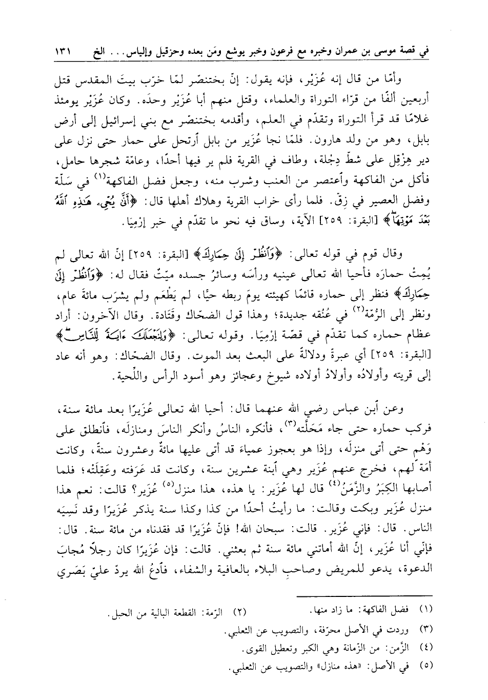 وأما من قال إنه عزير ، فإنه يقول : إن بختنصر لما خرب بيت المقدس قتل أربعين ألفاً من قراء التوراة والعلماء ، وقتل منهم أبا عزير وحده . وكان عزير يومئذ غلاماً قد قرأ التوراة وتقدم في العلم ، وأقدمه بختنصر مع بني إسرائيل إلى أرض بابل ، وهو من ولد هارون . فلما نجا عزير من بابل ارتحل على حمار حتى نزل على دير هزقل على شط دجلة ، وطاف في القرية فلم ير فيها أحداً ، وعامة شجرها حامل ، فأكل من الفاكهة واعتصر من العنب وشرب منه ، وجعل فضل الفاكهة في سلة وفضل العصير في زق . فلما رأى خراب القرية وهلاك أهلها قال : " أنى يحيي هذه الله بعد موتها " الآية ، وساق فيه نحو ما تقدم في خبر إرميا .