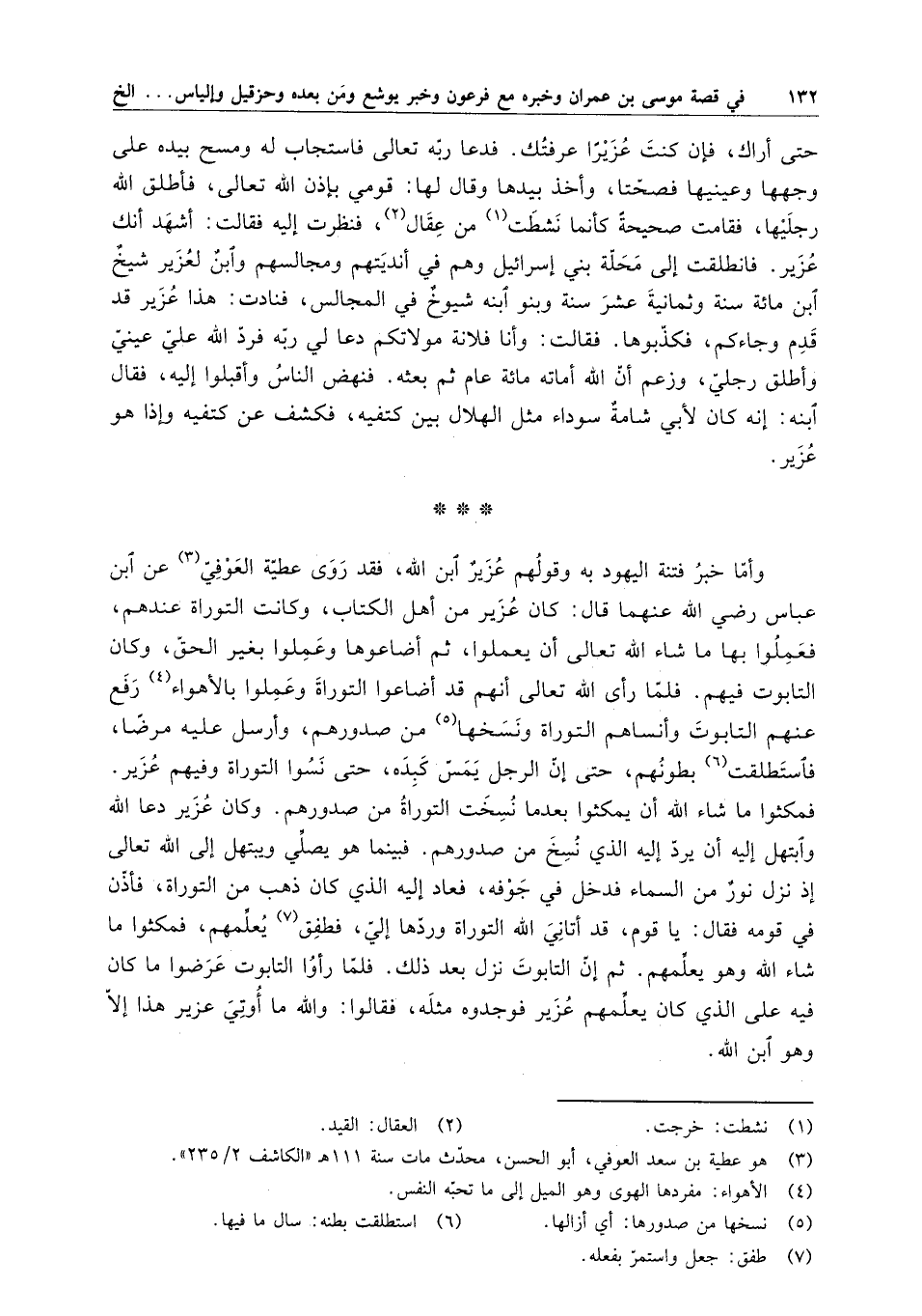 حتى أراك ، فإن كنت عزيراً عرفتك . فدعا ربه تعالى فاستجاب له ومسح بيده على وجهها وعينيها فصحتا ، وأخذ بيدها وقال لها : قومي بإذن الله تعالى ، فأطلق الله رجليها ، فقامت صحيحة كأنما نشطت من عقال ، فنظرت إليه فقالت : أشهد أنك عزير . فانطلقت إلى محلة بني إسرائيل وهم في أنديتهم ومجالسهم وابن لعزير شيخ ابن مائة سنة وثمانية عشر سنة وبنو ابنه شيوخ في المجالس ، فنادت : هذا عزير قد قدم وجاءكم ، فكذبوها . فقالت : وأنا فلانة مولاتكم دعا لي ربه فرد الله علي عيني وأطلق رجلي ، وزعم أن الله أماته مائة عام ثم بعثه . فنهض الناس وأقبلوا إليه ، فقال ابنه : إنه كان لأبي شامة سوداء مثل الهلال بين كتفيه ، فكشف عن كتفيه وإذا هو عزير .
