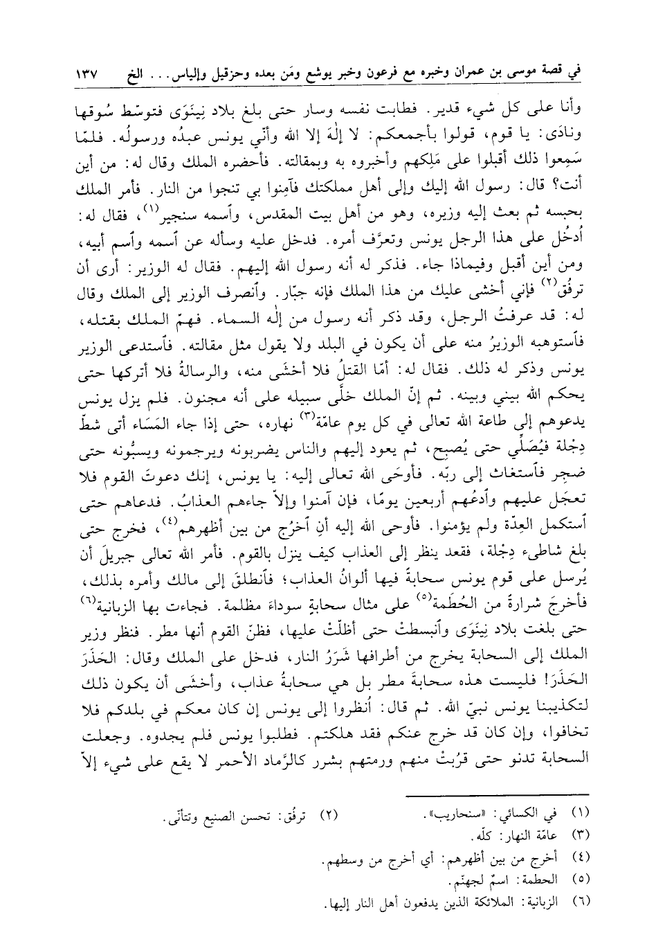وأنا على كل شيء قدير . فطابت نفسه وسار حتى بلغ بلاد نينوى فتوسط سوقها ونادى : يا قوم ، قولوا بأجمعكم : لا إله إلا الله وأني يونس عبده ورسوله . فلما سمعوا ذلك أقبلوا على ملكهم وأخبروه به بمقالته . فأحضره الملك وقال له : من أين أنت ؟ قال : رسول الله إليك وإلي أهل مملكتك فآمنوا بي تنجوا من النار . فأمر الملك بحبسه ثم بعث إليه وزيره ، وهو من أهل بيت المقدس ، واسمه سنجير ، فقال له : ادخل على هذا الرجل يونس وتعرف أمره . فدخل عليه وسأله عن اسمه واسم أبيه ، ومن أين أقبل وفي ماذا جاء . فذكر له أنه رسول الله إليهم . فقال له الوزير : أرى أن ترفق فإني أحشى عليك من هذا الملك فإنه جبار . وانصرف الوزير إلى الملك وقال له قد عرفت الرجل ، وقد ذكر أنه رسول من إله السماء . فهم الملك بقتله ، فاستوهبه الوزير منه على أن يكون في البلد ولا يقول مثل مقالته . فاستدعى الوزير يونس وذكر له ذلك . فقال له : أما القتل فلا أخشى منه ، والرسالة فلا أتركها حتى يحكم الله بيني وبينه . ثم إن الملك خلى سبيله على أنه مجنون . فلم يزل يونس يدعوهم إلى طاعة الله تعالى في كل يوم عامة نهاره ، حتى إذا جاء المساء أتى شط دجلة فيصلي حتى يصبح ، ثم يعود إليهم والناس يضربونه ويرجمونه ويسبونه حتى ضجر فاستغاث إلى ربه . فأوحى الله تعالى إليه : يا يونس ، إنك دعوت القوم فلا تعجل عليهم وادعهم أربعين يوماً ، فإن آمنوا وإلا جاءهم العذاب . فدعاهم حتى استكمل العدة ولم يؤمنوا . فأوحى الله إليه أن اخرج من بين أظهرهم ، فخرج حتى بلغ شاطئ دجلة ، فقعد ينظر إلى العذاب ؛ كيف ينزل العذاب فأمر الله تعالى جبريل أن يرسل على قوم يونس سحابة فيها ألوان العذاب ، فانطلق إلى مالك وأمره بذلك ، فأخرج شرارة من الحطمة على مثال سحابة سوداء مظلمة . فجاءت بها الزبانية حتى بلغت بلاد نينوى وانبسطت حتى أظلت عليها ، فظن القوم أنها مطر . فنظر وزير الملك إلى السحابة يخرج من أطرافها شرر النار ، فدخل على الملك وقال : الحذر الحذر فليست هذه سحابة مطر بل هي سحابة عذاب ، وأخشى أن يكون ذلك لتكذيبنا يونس نبي الله . ثم قال : انظروا إلى يونس إن كان معكم في بلدكم فلا تخافوا ، وإن كان قد خرج عنكم فقد هلكتم . فطلبوا يونس فلم يجدوه . وجعلت السحابة تدنو حتى قربت منهم ورمتهم بشرر كالرماد الأحمر لا يقع على شيء إلا