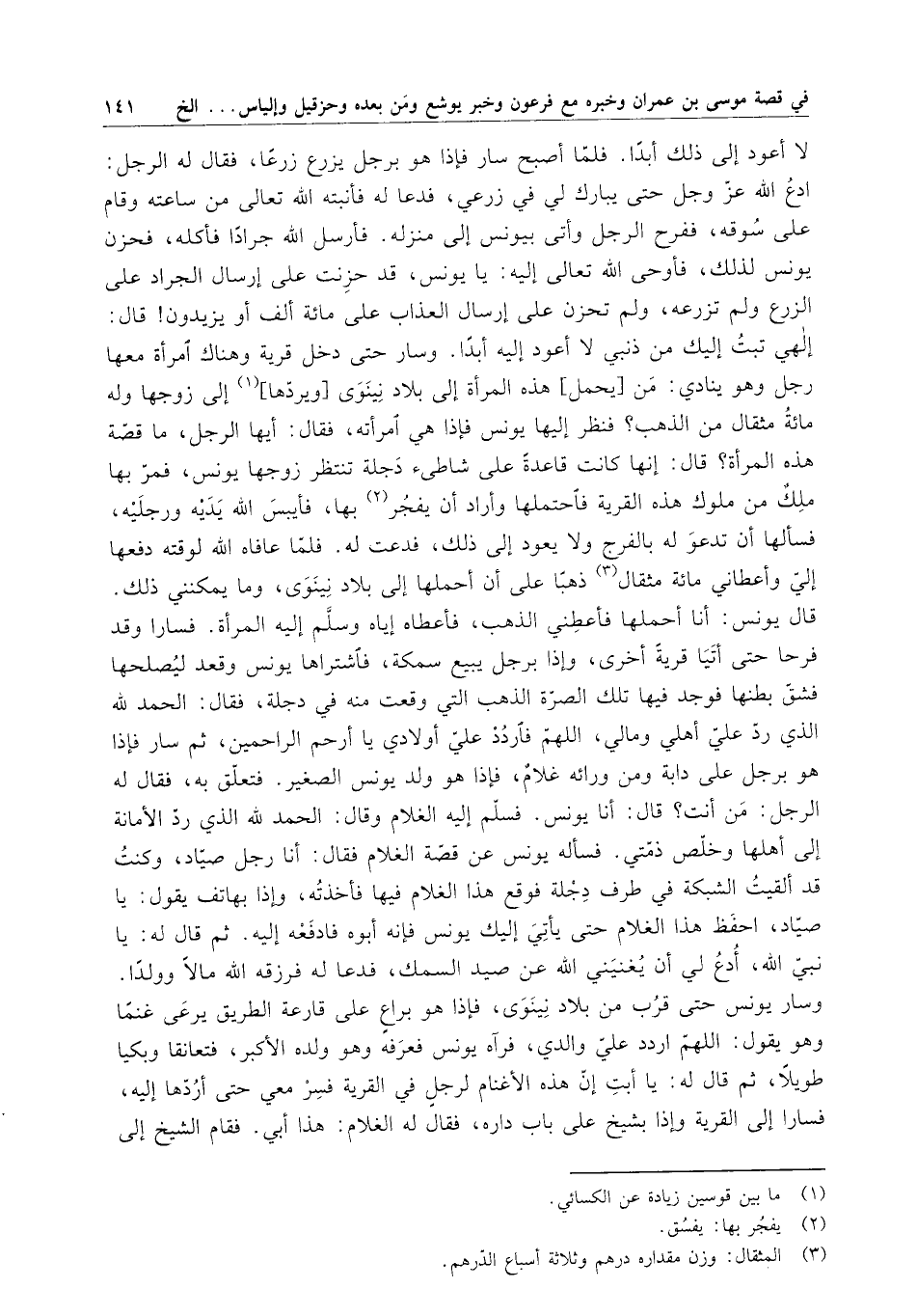 لا أعود إلى ذلك أبداً . ثم سار حتى دخل قرية أخرى وقت المساء ، فتلقاه رجل من أهل القرية وسأله أن ينزل عليه فنزل . فلما أكل وشرب نظر إلى بيت الرجل وفيه فخار كثير يريد أن يوقد عليه . فأوحى الله تعالى إليه : يا يونس ، قل لهذا الفاخراني أن يكسر الفخار الذي قد عمله . فقال يونس ذلك للفاخراني ، فقال : يا هذا أضفتك لما رأيت فيك من أثر الخير وإذا أنت رجل مجنون ، تأمرني أن أكسر فخاراً قد أتعبت فيه نفسي لأنتفع بثمنه قم الآن فاخرج من عندي ، وأخرجه . فأوحى الله تعالى إليه : يا يونس ، إنه أشفق على فخاره وسماك مجنوناً وأخرجك من منزله حين أمرته بكسره ، وأنت بعثت إلى مائة ألف أو يزيدون فدعوت عليهم ولم تفكر في هلاكهم فترحمهم . قال : إلهي لا أعود إلى ذلك أبداً . فلما أصبح سار فإذا هو برجل يزرع زرعاً ، فقال له الرجل : ادع الله عز وجل حتى يبارك لي في زرعي ، فدعا له فأنبته الله تعالى من ساعته وقام على سوقه ، ففرح الرجل وأتى بيونس إلى منزله . فأوحى الله تعالى إليه : يا يونس ، قد حزنت على إرسال الجراد على الزرع ولم تزرعه ، ولم تحزن على إرسال العذاب على مائة ألف أو يزيدون . قال : إلهي تبت إليك من ذنبي لا أعود إليه أبداً . وسار حتى دخل قرية وهناك امرأة معها رجل وهو ينادي : من يحمل هذه المرأة إلى بلاد نينوى ويردها إلى زوجها وله مائة مثقال من الذهب ؟ فنظر إليها يونس فإذا هي امرأته ، فقال : أيها الرجل ، ما قصة هذه المرأة ؟ قال : إنها كانت قاعدة على شاطئ دجلة تنظر زوجها يونس ، فمر بها ملك من ملوك هذه القرية فاحتملها وأراد أن يفجر بها ، فأيبس الله يديه ورجليه ، فسألها أن تدعو له بالفرج ولا يعود إلى ذلك ، فدعت له . فلما عافاه الله لوقته دفعها إلي وأعطاني مائة مثقال ذهباً على أن أحملها إلى بلاد نيونوى ، وما يمكنني ذلك . قال يونس : أنا أحملها فأعطني الذهب ، فأعطاه إياه وسلم إليه المرأة . فسار وقد فرحا حتى أتيا قرية أخرى ، وإذا برجل يبيع سمكة ، فاشتراها يونس وقعد ليصلحها فشق بطنها فوجد فيها تلك الصرة الذهب التي وقعت منه في دجلة ، فقال : الحمد لله الذي رد علي أهلي ومالي ، اللهم فاردد علي أولادي يا أرحم الراحمين ، ثم سار فإذا هو برجل على دابة ومن ورائه غلام ، فإذا هو ولد يونس الصغير . فتعلق به ، فقال له الرجل : من أنت ؟ قال : أنا يونس . فسلم إليه الغلام وقال : الحمد لله الذي ردالأمانة إلى أهلها وخلص ذمتي . فسأله يونس عن قصة الغلام فقال : أنا رجل صياد وكنت قد ألقيت الشبكة في طرف دجلة فوقع هذا الغلام فيها فأخذته ، وإذا بهاتف يقول : يا صياد ، احفظ هذا الغلام حتى يأتي إليك يونس فإنه أبوه فادفعه إليه . ثم قال له : يا نبي الله ، أدع لي أن يغنيني الله عن صيد السمك ، فدعا له فرزقه الله مالاً وولداً . وسار يونس حتى قرب من بلاد نينوى ، فإذا هو براع على قارعة الطريق يرعى غنماً وهو يقول : اللهم أردد علي والدي ، فرآه يونس فعرفه وهو ولده الأكبر ، فتعانقا وبكيا طويلاً ، ثم قال له : يا أبت إن هذه الأغنام لرجل في القرية فسر معي حتى أردها إليه ، فسار إلى القرية وإذا بشيخ على باب داره ، فقال له الغلام : هذا أبي . فقام الشيخ إلى