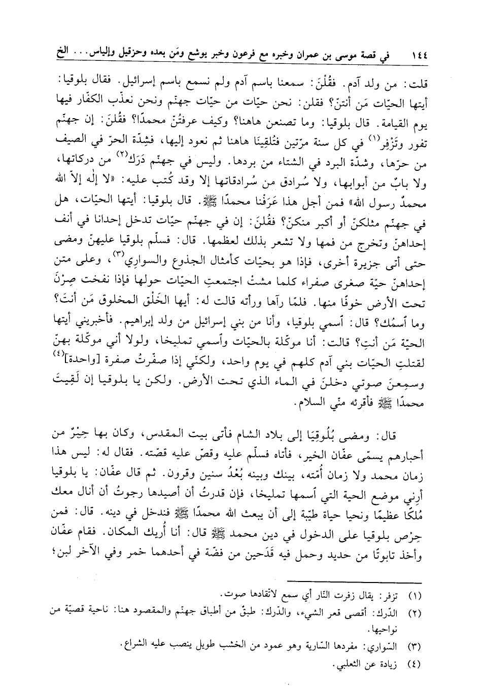 قلت : من ولد آدم . فقلن : سمعنا باسم آدم ولم نسمع باسم إسرائيل . فقال بلوقيا : أيتها الحيات من أنتن ؟ فقلن : نحن حيات من حيات جهنم ونحن نعذب الكفار فيها يوم القيامة . قال بلوقيا : وما تصنعن هاهنا ؟ وكيف عرفتن محمداً ؟ فقلن : إن جهنم تفور وتزفر في كل سنة مرتين فتلقينا هاهنا ثم نعود إليها ، فشدة الحر في الصيف من حرها ، وشدة البرد في الشتاء من بردها . وليس في جهنم درك من دركاتها ، ولا باب من أبوابها ، ولا سرادق من سرادقاتها إلا وقد كتب عليه : " لا إله إلا الله محمد رسول الله " . فمن أجل هذا عرفنا محمداً ( صلى الله عليه وسلم ) . قال بلوقيا : أيتها الحيات ، هل في جهنم مثلكن أو أكبر منكن ؟ فقلن : إن في جهنم حيات تدخل إحدانا في أنف إحداهن وتخرج من فمها ولا تشعر بذلك لعظمها . قال : فسلم بلوقيا عليهن ومضى حتى أتى جزيرة أخرى ، فإذا هو بحيات كأمثال الجذوع والسواري ، وعلى متن إحداهن حية صغرى صفراء كلما مشت اجتمعت الحيات . حولها فإذا نفخت صرن تحت الأرض خوفاً منها . فلما رآها ورأته قالت له : أيها الخلق المخلوق من أنت ؟ وما اسمك ؟ قال : اسمي بلوقيا ، وأنا من بني إسرائيل من ولد إبراهيم . فاخبريني أيتها الحية من أنت ؟ قالت : أنا موكلة بالحيات واسمي تمليخا ، ولولا أني موكلة بهن لقتلت الحيات بني آدم كلهم في يوم واحد ، ولكني إذا صفرت صفرة واحدة وسمعن صوتي دخلن في الماء الذي تحت الأرض . ولكن يا بلوقيا إن لقيت محمد ( صلى الله عليه وسلم ) فأقرئه مني السلام . قال : ومضى بلوقيا إلى بلاد الشام فأتى بيت المقدس ، وكان بها حبر من أحبارهم يسمى عفان الخير ، فأتاه فسلم عليه وقص عليه قصته . فقال له : ليس هذا زمان محمد ولا زمان أمه ، وبينك وبينه بعد سنين وقورن . ثم قال عفان : يا بلوقيا أرني موضع الحية التي اسمها تمليخا ، فإن قدرت أن أصيدها رجوت أن أنال معك ملكاً عظيماً ونحيا حياة طيبة إلى أن يبعث الله محمداً ( صلى الله عليه وسلم ) فندخل في دينه . قال : فمن حرص بلوقيا على الدخول في دين محمد ( صلى الله عليه وسلم ) قال : أنا أريك المكان . فقام عفان وأخذ تابوتاً من حديد وحمل فيه قدحين من فضة في أحدهما خر وفي الآخر لبن ؛