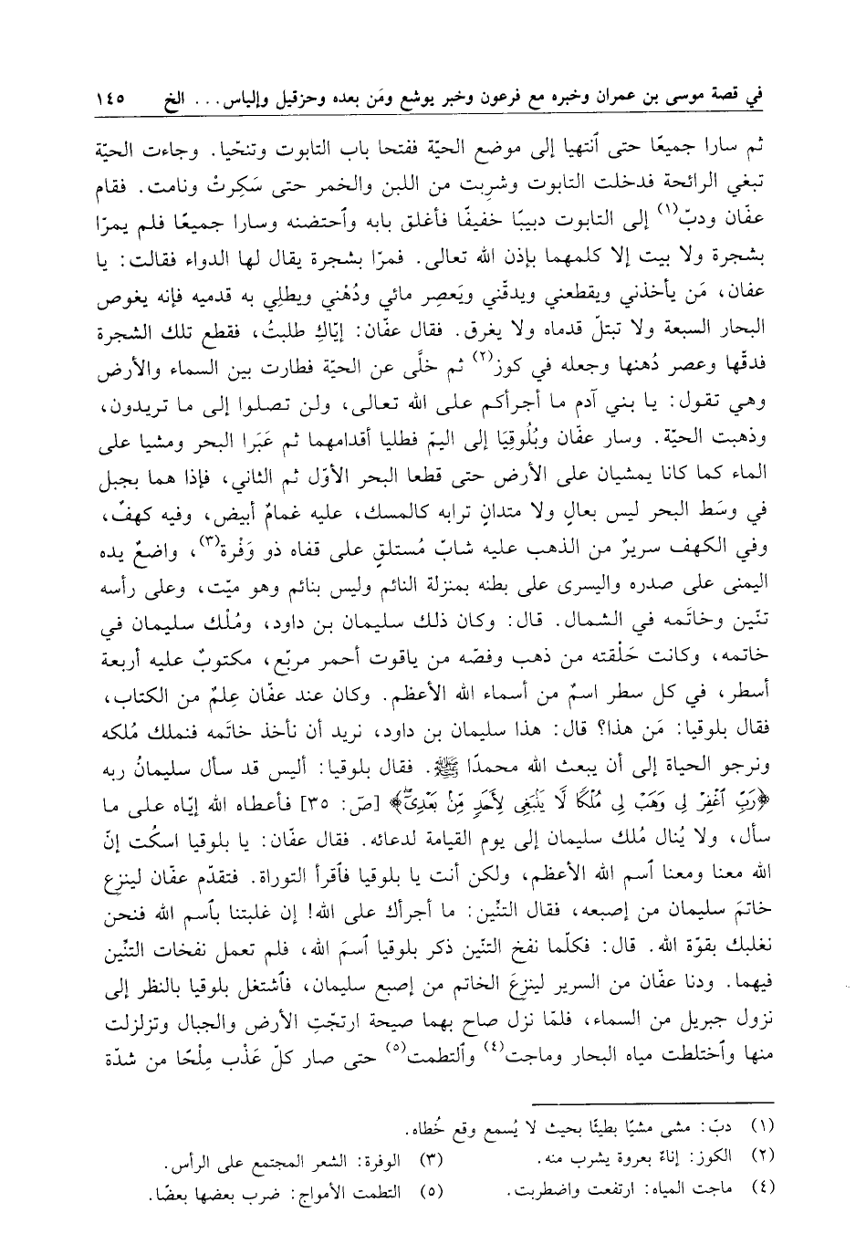 ثم سارا جميعاً حتى انتهيا إلى موضع الحية ففتحا باب التابوت وتنحيا . وجاءت الحية تبغي الرائحة فدخلت التابوت وشربت من اللبن والخمر حتى سكرت ونامت . فقام عفان ودب إلى التابوت دبيباً خفيفاً فأغلق بابه واحتضنه وسارا جميعاً فم يمرا بشجرة ولا بيت إلا كلمهما بإذن اله تعالى . فمرا بشجرة يقال لها الدواء فقالت : يا عفان ، من يأخذني ويقطعني ويدقني ويعصر مائي ودهني ويطلي به قدميه فإنه يغوص البحار السبعة ولا تبتل قدماه ولا يغرق . فقال عفان : إياك طلبت ، فقطع تلك الشجرة فدقها وعصر دهنها وجعله في كوز ثم خلى عن الحية فطارت بين السماء والأرض وهي تقول : يا بني آدم ما أجرأكم على الله تعالى ، ولن تصلوا إلى ما تريدون ، وذهبت الحية . وسار عفان وبلوقيا إلى اليم فطليا أقدامهما ثم عبرا البحر ومشيا على الماء كما كانا يمشيان على الأرض حتى قطعا البحر الأول ثم الثاني ، فإذا هما بجبل في وسط البحر ليس بعال ولا متدان ترابه كالمسك ، عليه غمام أبيض ، وفيه كهف ، وفي الكهف سرير من الذهب عليه شاب مستلق على قفاه ذو وفرة ، واضع يده اليمنى على صدره واليسرى على بطنه بمنزلة النائم وليس بنائم وهو ميت ، وعلى رأسه تنين وخاتمه في الشمال . قال : وكان ذلك سليمان بن داود ، وملك سليمان في خاتمه ، وكانت حلقته من ذهب وفضة من ياقوت أحمر مربع ، مكتوب عليه أربعة أسطر ، في كل سطر اسم من أسماء الله الأعظم . وكان عند عفان علم من الكتاب ، فقال بلوقيا : من هذا ؟ قال : هذا سليمان بن داود ، نريد أن نأخذ خاتمه فنملك ملكه ونرجو الحياة إلى أن يبعث الله محمد ( صلى الله عليه وسلم ) . فقال بلوقيا : أليس قد سأل سليمان ربه : " رب هب لي ملكاً لا ينبغي لأحد من بعدي " فأعطاه الله إياه على ما سأل ، ولا ينال ملك سليمان إلى يوم القيامة لدعائه . فقال عفان : يا بلوقيا اسكت إن الله معنا ومعنا اسم الله الأعظم ، ولكن أنت يا بلوقيا فاقرأ التوراة . فتقدم عفان لينزع خاتم سليمان من إصبعه ، فقال التنين : ما أجرأك على الله إن غلبتنا باسم الله فنحن نغلبك بقوة الله . قال : فكلما نفخ التنين ذكر بلوقيا اسم الله ، فلم تعلم نفخات التنين فيهما . ودنا عفان من السرير لينزع الخاتم من إصبع سليمان ، فاشتغل بلوقيا بالنظر إلى نزول جبريل من السماء ، فلما نزل صاح بهما صيحة ارتجت الأرض والجبال وتزلزت منها واختلطت مياه البحار وماجت والتطمت حتى صار كل عذب ملحاً من شدة