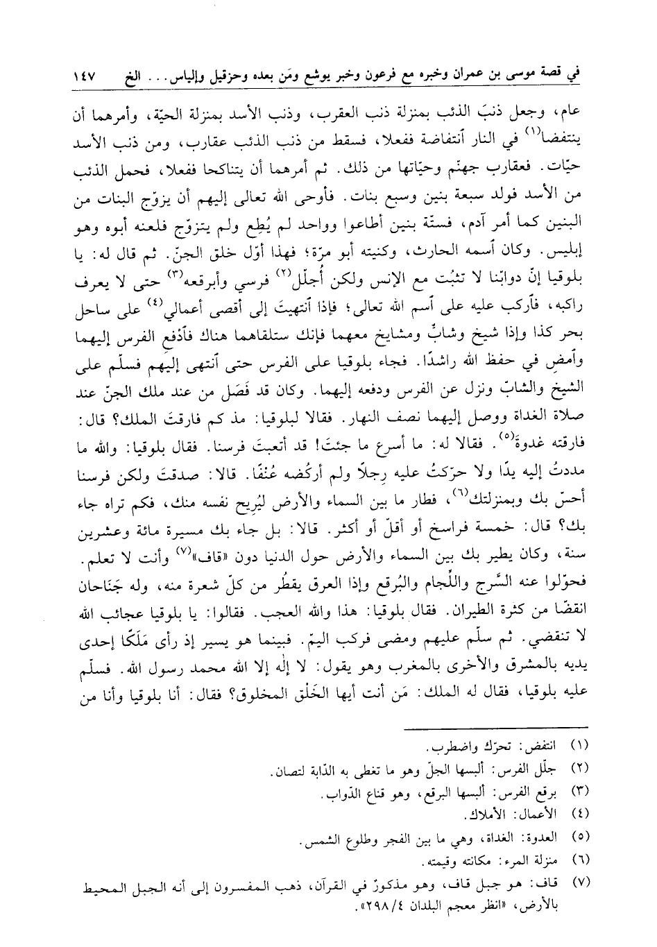 عام ، وجعل ذنب الذئب بمنزلة ذنب العقرب ، وذنب الأسد بمنزلة الحية ، وأمرهما أن ينتفضا في النار انتفاضة ففعلا ، فسقط من ذنب الذئب عقارب ، ومن ذنب الأسد حيات . فعقارب جهنم وحياتها من ذلك . ثم أمرهما أن يتناكحا ففعلاً ، فحمل الذئب من الأسد فولد سبعة بنين وسبع بنات . فأوحى الله تعالى إليهم أن يزوج البنات من البنين كما أمر آدم ، فستة بنين أطاعوا وواحد لم يطع ولم يتزوج فلعنه أبوه وهو إبليس . وكان اسمه الحارث ، وكنيته أبو مرة ؛ فهذا أول خلق الجن . ثم قال له : يا بلوقيا إن دوابنا لا تثبت مع الإنس ولكن أجلل فرسي وأبرقعه حتى لا يعرف راكبه ، فأركب عليه على اسم الله تعالى ؛ فإذا انتهيت إلى أقصى أعمالي على ساحل بحر كذا وإذا شيخ وشاب ومشايخ معهما فإنك ستلقاهما هناك فادفع الفرس إليهما وامض في حفظ الله راشداً . فجاء بلوقيا على الفرس حتى انتهى إليهم فسلم على الشيخ والشاب ونزل عن الفرس ودفعه إليهما . وكان قد فصل من عند ملك الجن عند صلاة الغداة ووصل إليهما نصف النهار . فقالا لبلوقيا : مذ كم فارقت الملك ؟ قال : فارقته غدوة . فقالا له : ما أسرع ما جئت قد أتعبت فرسنا . فقال بلوقيا : والله ما مددت إليه يداً ولا حركت عليه رجلاً ولم أركضه عنفاً . قالا : صدقت ولكن فرسنا أحسن بك وبمنزلتك ، فطار ما بين السماء والأرض ليريح نفسه منك ، فكم تراه جاء بك ؟ قال : خمسة فراسخ أو أقل أو أكثر . قالا : بل جاء بك مسيرة مائة وعشرين سنة ، وكان يطير بك بين السماء والأرض حول الدنيا دون قاف وأنت لا تعلم . فحولوا عنه السرج واللجام والبرقع وإذا العرق يقطر من كل شعرة منه ، وله جناحان انقضا من كثر الطيران . فقال بلوقيا : هذا والله العجب . فقالوا : يا بلوقيا عجائب الله لا تنقضي . ثم سلم عليهم ومضى فركب اليم . فبينما هو يسير إذ رأى ملكاً إحدى يديه بالمشرق والأخرى بالمغرب وهو يقول : لا إله إلا الله محمد رسول الله . فسلم عليه بلوقيا ، فقال له الملك من أنت أيها الخلق المخلوق ؟ فقال : أنا بلوقيا وأنا من