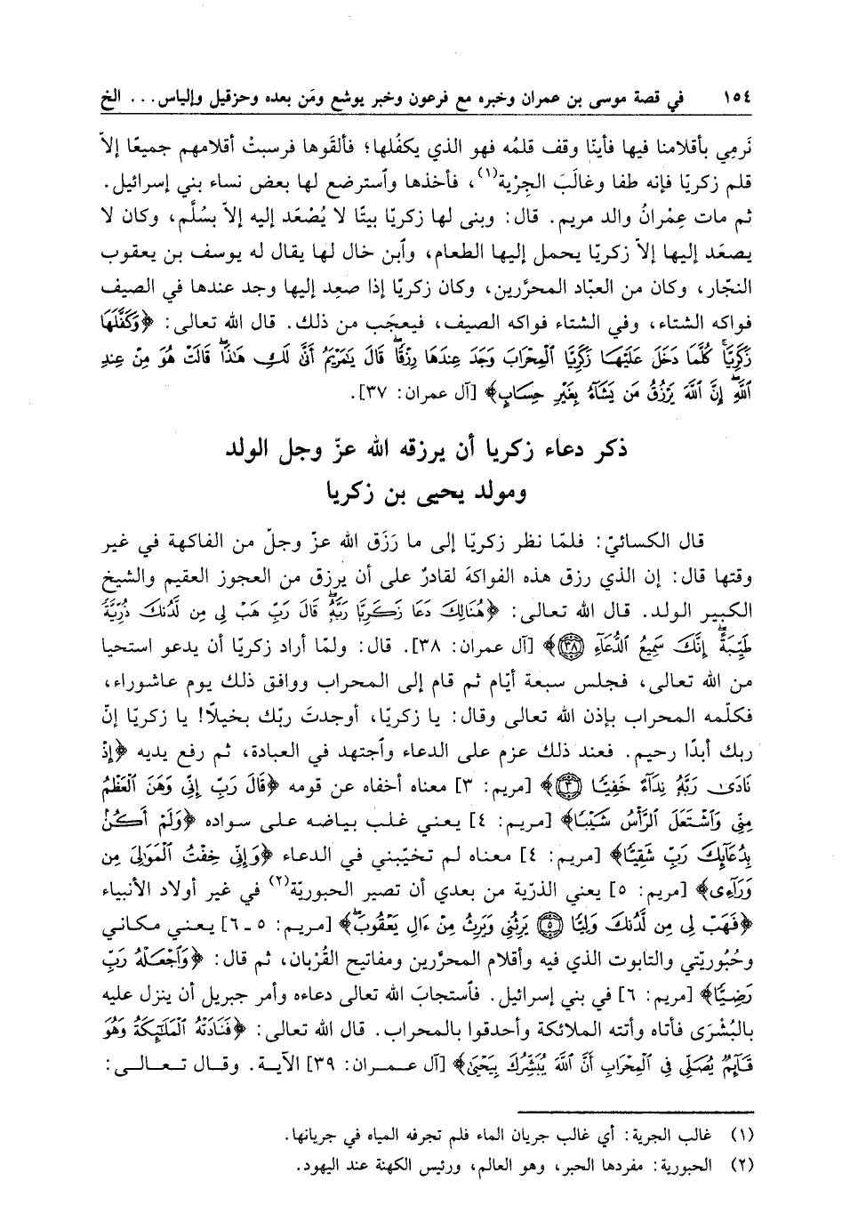 نرمي بأقلامنا فيها فأينا وقف قلمه فهو الذي يكفلها ؛ فألقوا فرسيت أقلامهم جميعاً إلا قلم زكريا فإنه طفا وغالب الجرية ، فأخذها واسترضع لها بعض نساء بني إسرائيل . ثم مات عمران والد مريم . قال : وبنى لها زكريا بيتاً لا يصعد إليه إلا بسلم ، وكان لا يصعد إليها إلا زكريا يحمل إليها الطعام ، وابن خال لها يقال له يوسف بن يعقوب النجار ، وكان من العباد المحررين ، وكان زكريا إذا صعد إليها وجد عندها في الصيف فواكه الشتاء ، وفي الشتاء فواكه الصيف ، فيعجب من ذلك . قال الله تعالى : " وكفلها زكريا كلما دخل عليها زكريا المحراب وجد عندها رزقاً قال يا مريم أنى لك هذا قالت هو من عند الله إن الله يرزق من يشاء بغير حساب " .