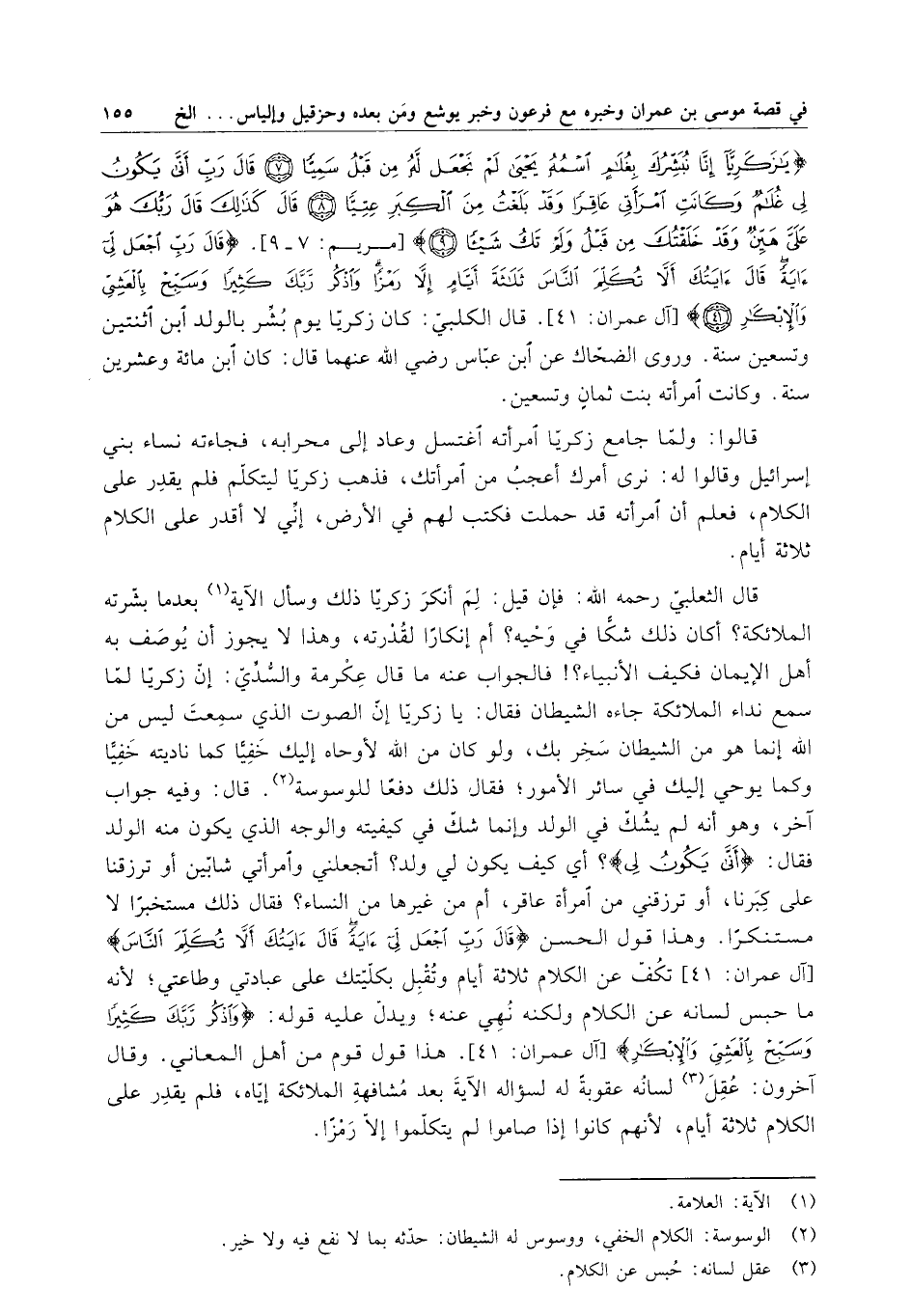 قالوا : ولما جامع زكريا امرأته اغتسل وعاد إلى محرابه ، فجاءته نساء بني إسرائيل وقالوا له : نرى أمرك أعجب من امرأتك ، فذهب زكريا ليتكلم فلم يقدر على الكلام ، فعلم أن امرأته قد حملت فكتب لهم في الأرض ، إني لا أقدر على الكلام ثلاث أيام . قال الثعلبي رحمه الله . فإن قيل : لم أنكر زكريا ذلك وسأل الآية بعد ما بشرته الملائكة ؟ أكان ذلك شكاً في وحيه ؟ ، أم إنكاراً لقدرته ، وهذا لا يجوز أن يوصف به أهل الإيمان فكيف الأنبياء ؟ فالجواب عنه ما قال عكرمة والسدي : إن زكريا لما سمع نداء الملائكة جاءه الشيطان فقال : يا زكريا إن الصوت الذي سمعت ليس من الله إنما هو من الشيطان سخر بك ، ولو كان من الله لأوحاه إليك خفياً كما ناديته خفياً وكما يوحى إليك في سائر الأمور ؛ فقال ذلك دفعاً للوسوسة . قال : وفيه جواب آخر ، وهو أنه لم يشك في الولد وإنما شك في كيفيته والوجه الذي يكون منه الولد فقال : " أنى يكون لي " أي كيف يكون لي ولد ؟ أتجعلني وامرأتي شابين أو ترزقنا على كبرنا ، أو ترزقني من امرأة عاقر ، أم من غيرها من النساء ؟ فقال ذلك مستخبراً لا مستنكراً . وهذا قول الحسن . " قال رب اجعل لي آية قال آيتك ألا تكلم الناس " تكف عن الكلام ثلاثة أيام وتقبل بكليتك على عبادتي وطاعتي ؛ لأنه ما حبس لسانه عن الكلام ولكنه نهى عنه ؛ ويدل عليه قوله : " واذكر ربك كثيراً وسبح بالعشي والإبكار " . هذا قول قوم من أهل المعاني . وقال آخرون : عقل لسانه عقوبة له لسؤاله الآية بعد مشافهة الملائكة إياه ، فلم يقدر على الكلام ثلاثة أيام ، لأنهم كانوا إذا صاموا لم يتكلموا إلا رمزاً .