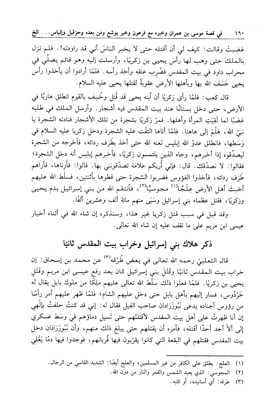 قال الثعلبي رحمه الله تعالى في بعض طرقه عن محمد بن إسحاق : إن خراب بيت المقدس ثانياً وقتل بني إسرائيل كان بعد رفع عيسى بن مريم وقتل يحيى بن زكريا . فلما فعلوا ذلك سلط الله تعالى عليهم ملكاً من ملوك بابل يقال له خردوس ، فسار إليهم بأهل باب حتى دخل عليهم الشام ؛ فلما ظهر عليهم أمر رأسا من رءوس أجناده يدعى نبوزرادان صاحب الفيل فقال له : إني قد كنت حلفت بإلهي إن أنا ظهرت على أهل بيت المقدس لأقتلنهم حتى تسيل دماؤهم في وسط عسكري إلى ألا أجد أحد أقتله ، فأمره أن يقتلهم حتى يبلغ ذلك منهم ، وأن نبوزرادان دخل بيت المقدس فقتلهم في البقعة التي كانوا يقربون فيها قربانهم ، فوجدوا فيها دماً يغلي