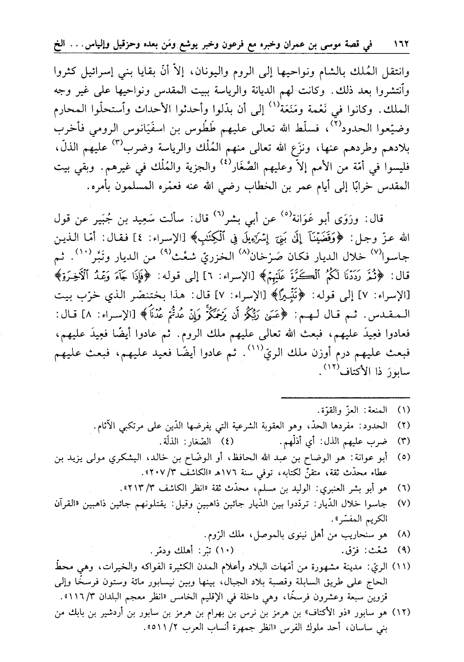 وانتقل الملك بالشام ونواحيها إلى الروم واليونان ، إلا أن بقايا بني إسرائيل كثروا وانتشروا بعد ذلك . وكانت لهم الديانة والرياسة ببيت المقدس ونواحيها على غير وجه الملك . وكانوا في نعمة ومنعة إلى أن بدلوا وأحدثوا الأحداث واستحلوا المحارم وضيعوا الحدود ، فسلط الله تعالى عليهم ططوس بن اسفيانوس الرومي فأخرب بلادهم وطردهم عنها ، ونزع الله تعالى منهم الملك والرياسة وضرب عليهم الذل ، فليسوا في أمة من الأمم إلا وعيهم الصغار والجزية والملك في غيرهم . وبقي بيت المقدس خراباً إلى أيام عمر بن الخطاب رضي الله عنه فعمره المسلمون بأمره . قال : وروى أبو عوانة عن أبي بشر قال : سألت سعيد بن جبير عن قول الله عز وجل : " وقضينا إلى بني إسرائيل في الكتاب " الآيات فقال : أما الذي جاسوا خلال الديار فكان صرخان الخزري شعث من الديار وتبر . ثم قال : " ثم رددنا لكم الكرة عليهم " إلى قوله : " فإذا جاء وعد الآخرة " إلى قوله : " تتبيراً " قال : هذا بختنصر الذي خرب بيت المقدس . ثم قال لهم : " عسى ربكم أن يرحمكم وإن عدتم عدنا " قال : فعادوا فعيد عليهم ، فبعث الله تعالى عليهم ملك الروم . ثم عادوا أيضاً فعيد عليهم ، فبعث عليهم درم أوزن ملك الري . ثم عادوا أيضاً فعيد عليهم ، فبعث عليهم سابور ذا الأكتاف .