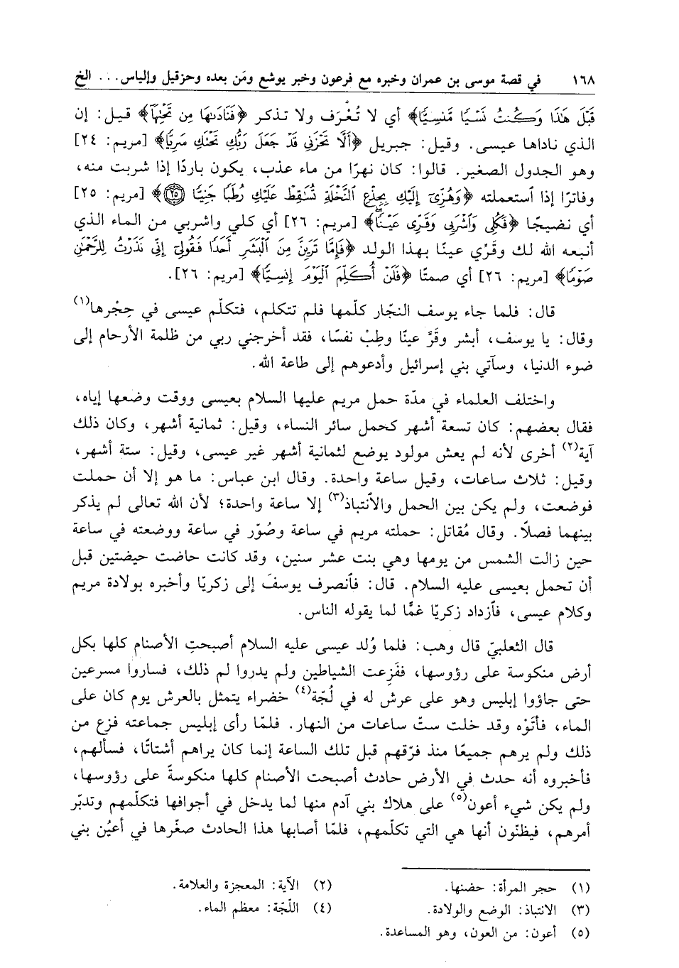 قبل هذا وكنت نسياً منسياً " . قال : واشتد عليها البرد ، فعمد يوسف إلى حطب فجعله حولها كالحظيرة ، ثم أشعل فيه النار فأدفأها ، وكسر لها سبع جوزات فأكلتها . فمن أجل ذلك توقد النصارى النار ليلة الميلاد وتلعب بالجوز . قال وقال كعب : إنها خرجت منفردة ، فلما فقدها زكريا أهمه ذلك ، وبعث يوسف النجار في طلبها ، فجاء حتى نظر إليها تحت النخلة . قال : ولما شكت من ألم الولادة ما شكت وقالت : " يا ليتني مت قبل هذا وكنت نسياً منسياً " أي لا تعرف ولا تذكر " فناداها من تحتها " - قيل : إن الذي ناداها عيسى . وقيل : جبريل - " أن لا تحزني قد جعل ربك تحتك سرياً " وهو الجدول الصغير . قالوا : كان نهراً من ماء عذب ، يكون بارداً إذا شربت منه ، وفاتراً إذا استعملته " وهزي إليك بجذع النخلة تساقط عليك رطباً جنياً " أي نضيجا " فكلي واشربي وقري عيناً " أي كلي واشربي من الماء الذي أنبعه الله لك وقري عيناً بهذا الولد " فإما ترين من البشر أحداً فقولي إني نذرت للرحمن صوماً " أي صمتاً " فلن أكلم اليوم إنسياً " قال : فلما جاء يوسف النجار كلمها فلم تتكلم ، فتكلم عيسى في حجرها وقال : يا يوسف ، أبشر وقر عيناً وطب نفساً ، فقد أخرجني ربي من ظلمة الرحم إلى ضوء الدنيا ، وسآتي بني إسرائيل وأدعوهم إلى طاعة الله .