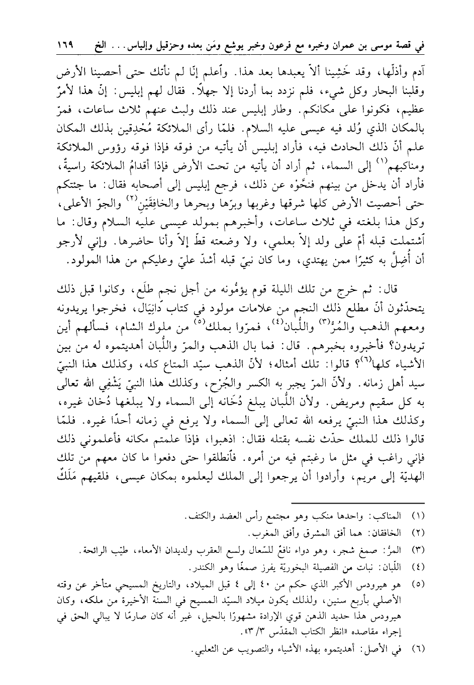 قال : ثم خرج من تلك الليلة قوم يؤمونه من أجل نجم طلع ، وكانوا قبل ذلك يتحدثون أن مطلع ذلك النجم من علامات مولود في كتاب دانيال ، فخرجوا يريدونه ومعهم الذهب والمُرُّ واللبان ، فمروا بملك من ملوك الشام ، فسألهم أين تريدون ؟ فأخبروه بخبرهم . قال : فما بال الذهب والمر واللبان أهديتموه له من بين الأشياء كلها ؟ قالوا : تلك أمثاله ؛ لأن الذهب سيد المتاع كله ، وكذلك هذا النبي سيد أهل زمانه . ولأن المر يجبر به الكسر والجرح ، وكذلك هذا النبي يشفي الله تعالى به كل سقيم ومريض . ولأن اللبان يبلغ دخانه إلى السماء ولا يبلغها دخان غيره ، وكذلك هذا النبي يرفعه الله تعالى إلى السماء ولا يرفع في زمانه أحداً غيره . فلما قالوا ذلك للملك حدث نفسه بقتله فقال : اذهبوا ، فإذا علمتم مكانه فاعلموني ذلك فإني راغب في مثل ما رغبتم فيه من أمره . فانطلقوا حتى دفعوا ما كان معهم من تلك الهدية إلى مريم ، وأرادوا أن يرجعوا إلى الملك ليعلموه بمكان عيسى ، فلقيهم ملك