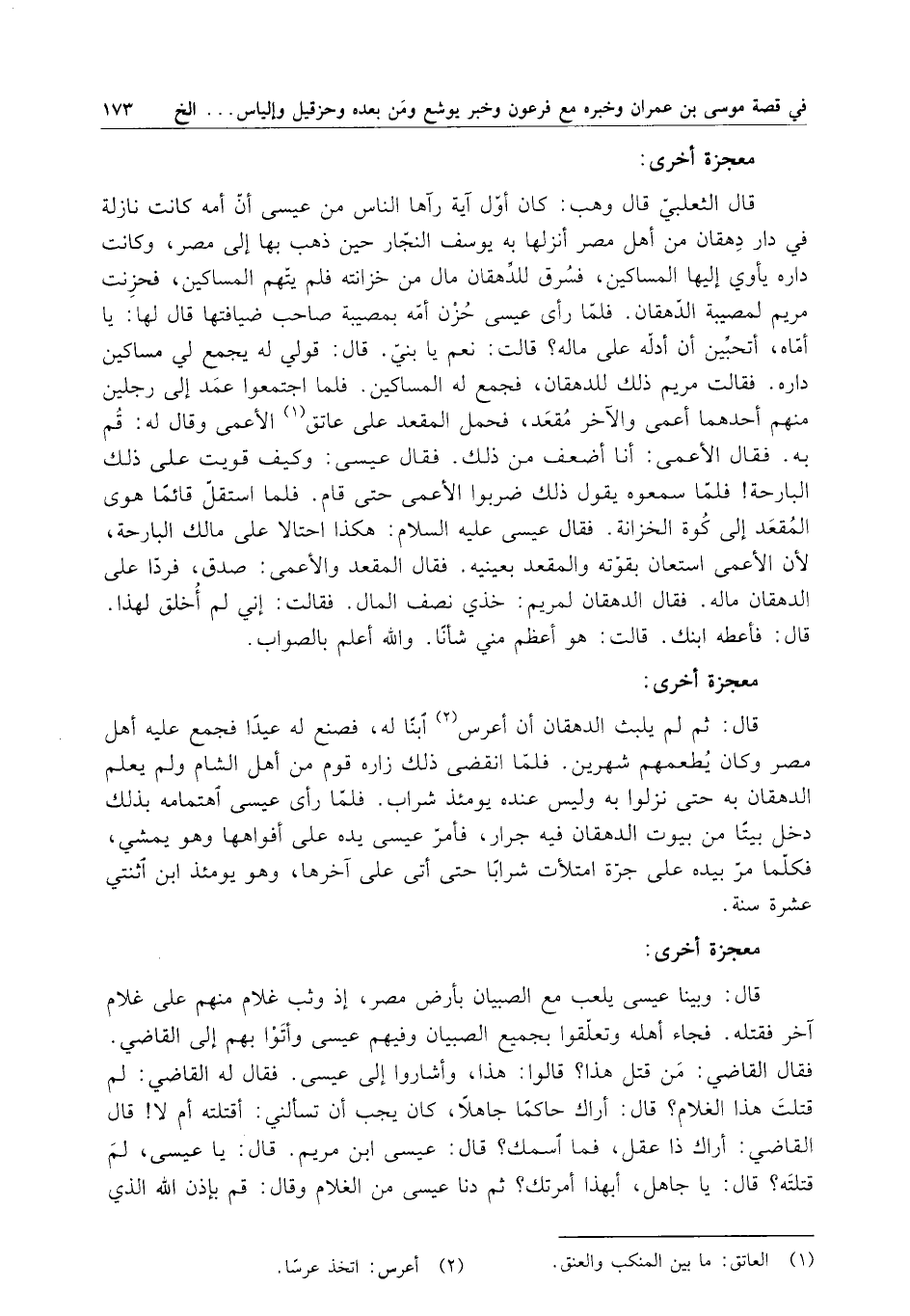 معجزة أخرى : قال : وبينا عيسى يلعب مع الصبيان بأرض مصر ، إذ وثب غلام منهم على غلام آخر فقتله . فجاء أهله وتعلقوا بجميع الصبيان وفيهم عيسى وأتوا بهم إلى القاضي . فقال القاضي : من قتل هذا ؟ قالوا : هذا ، وأشاروا إلى عيسى . فقال له القاضي : لم قتلت هذا الغلام ؟ قال : أراك حاكماً جاهلاً ، كان يجب أن تسألني : أقتلته أم لا قال القاضي : أراك ذا عقل ، فما اسمك ؟ قال عيسى بن مريم . قال : يا عيسى ، لم قتلته ؟ قال : يا جاهل ، أبهذا أمرتك ؟ ثم دنا عيسى من الغلام وقال : قم بإذن الله الذي