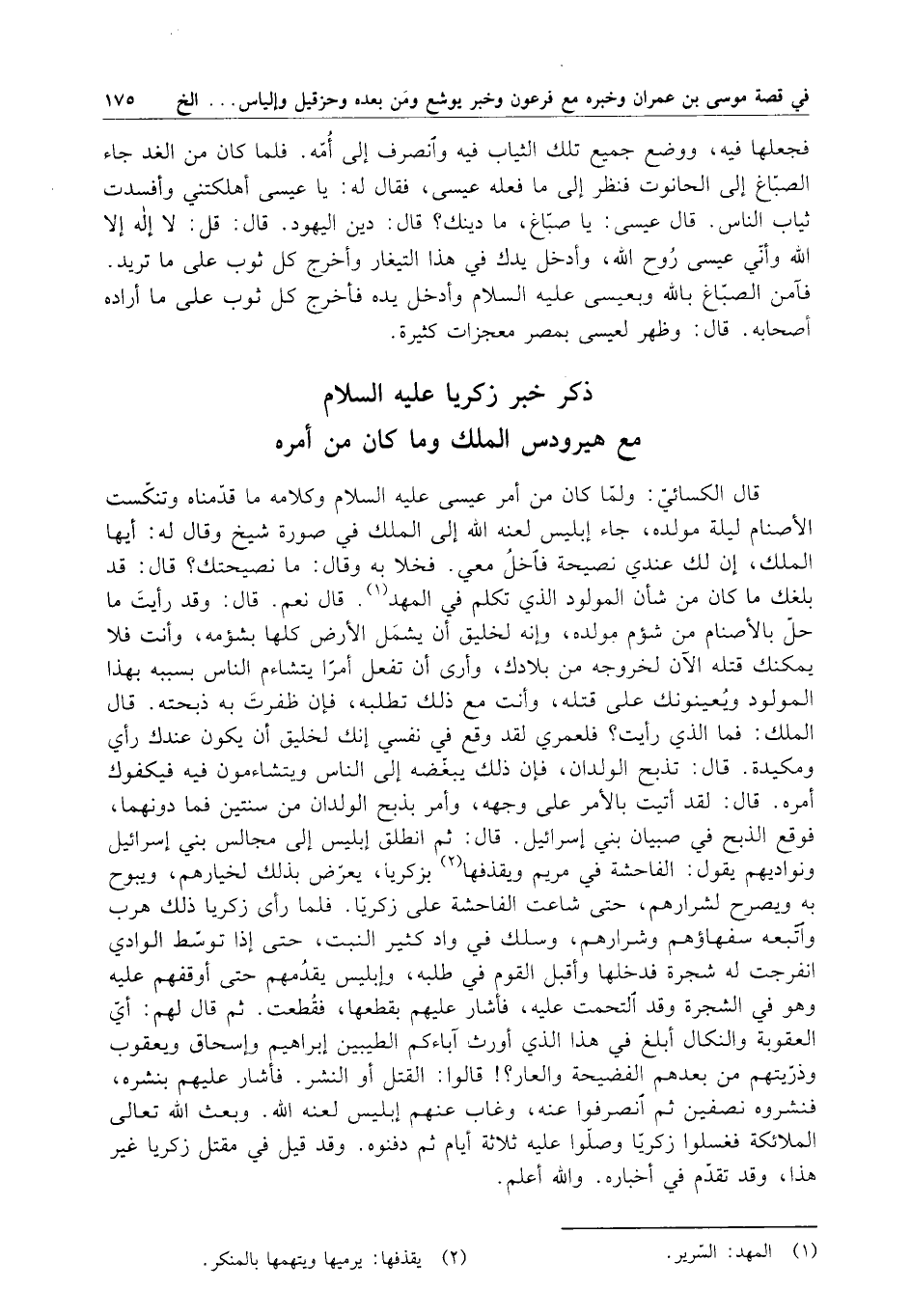 قال الكسائي : ولما كان من أمر عيسى - ع - وكلامه ما قدمناه وتنكست الأصنام ليلة مولده ، جاء إبليس لعنه الله إلى الملك في صورة شيخ وقال له : أيها الملك ، إن لك عندي نصيحة فاخل معي . فخلا به وقال : ما نصيحتك ؟ قال : قد بلغك ما كان من شأن المولود الذي تكلم في المهد . قال نعم . قال : وقد رأيت ما حل بالأصنام من شؤم مولده ، وإنه لخلق أن يشمل الأرض كلها بشؤمه ، وأنت فلا يمكنك قتله الآن لخروجه من بلادك ، وأرى أن تفعل أمراً يتشاءم الناس بسببه بهذا المولود يعينونك على قتله ، وأنت مع ذلك تطلبه . فإن ظفرت به ذبحته . قال الملك : فما الذي رأيت ؟ فلعمري لقد وقع في نفسي إنك لخليق أن يكون عندك رأي ومكيدة . قال : تذبح الولدان ، فإن ذلك يبغضه إلى الناس ويتشاءمون به فيكفوك أمره . قال : لقد أتيت بالأمر على وجهه ، وأمر بذبح الولدان من سنتين فما دونهما ، فوقع الذبح في صبيان بني إسرائيل . قال : ثم انطلق إبليس إلى مجلس بني إسرائيل وموادبهم يقول : الفاحشة في مريم ويقذفها بزكريا ، يعرض بذلك لخيارهم ، ويبوح به ويصرح لشرارهم ، حتى شاعت الفاحشة على زكريا . فلما رأى زكريا ذلك هرب واتبعه سفهاؤهم وشرارهم ، وسلك في واد كثير النبت ، حتى إذا تواسط الوادي انفرجت له شجرة فدخلها وأقبل القوم في طلبه ، وإبليس يقدمهم حتى أوقفهم عليه وهو في الشجرة وقد التحمت عليه ، فأشار عليهم بقطعها ، فقطعت . ثم قال لهم : أي العقوبة والنكال أبلغ في هذا الذي أورث آباءكم الطيبين إبراهيم وإسحاق ويعقوب وذريتهم من بعدهم الفضيحة والعار ؟ . قالوا : القتل أو النشر . فأشار عليهم بنشره ، فنشروه نصفين ثم انصرفوا عنوه ، وغاب عنهم إبليس لعنه الله . وبعث الله تعالى الملائكة فغسلوا زكريا وصلوا عليه ثلاثة أيام ثم دفنوه . وقد قيل في مقتل زكريا غير هذا ، وقد تقدم في أخباره . والله أعلم .