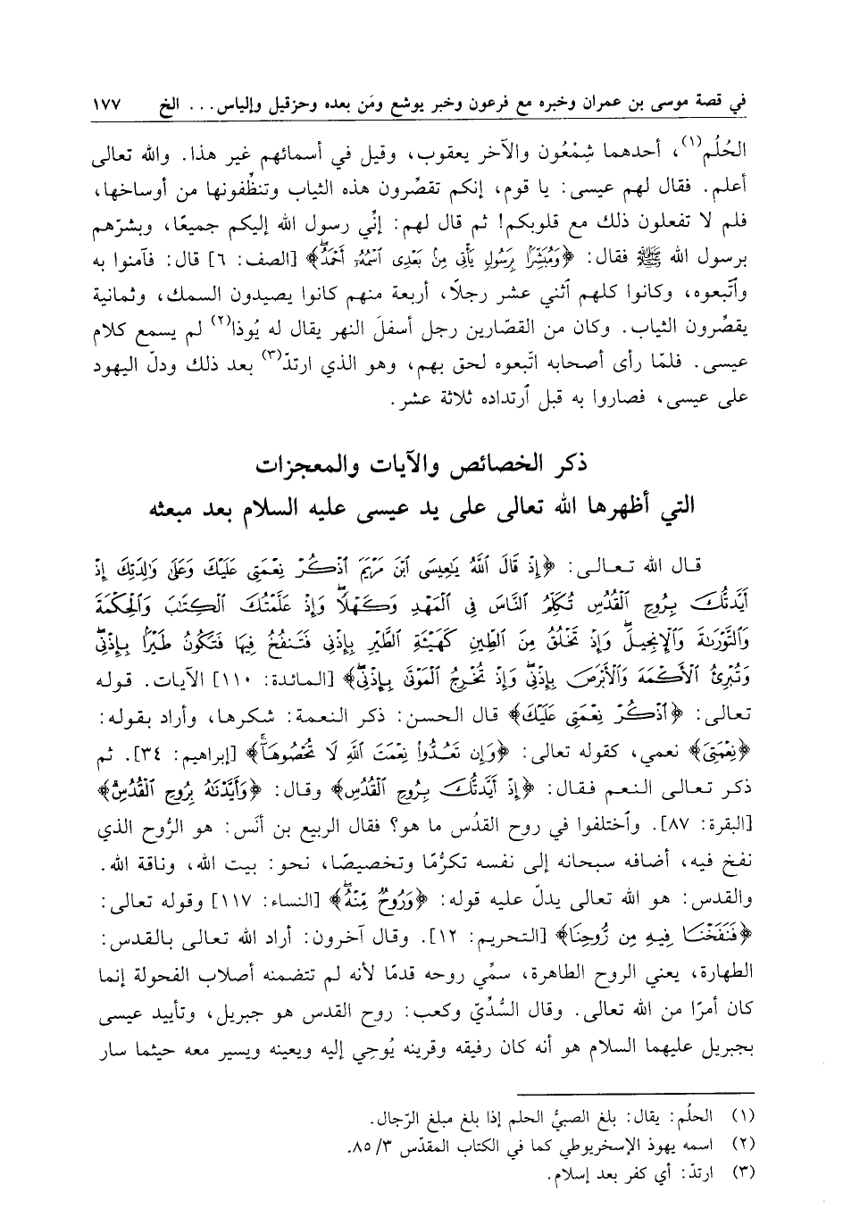 الحلم ، أحدهما شمعون والآخر يعقوب ، وقيل في أسمائهم غير هذا . والله أعلم . فقال لهم عيسى : يا قوم ، إنكم تقصرون هذه الثياب وتنظفونها من أوساخها ، فلم لا تفعلون ذلك مع قلوبكم . ثم قال لهم : إني رسول الله إليكم جميعاً ، وبشرهم برسول الله ( صلى الله عليه وسلم ) فقال : " ومبشراً برسول يأتي من بعدي اسمه أحمد " قال : فأمنوا به واتبعوه ، وكانوا كلهم اثني عشر رجلاً ، أربعة منهم كانوا يصيدون السمك ، وثمانية يقصرون الثياب . وكان من القصارين رجل أسفل النهر يقال له يوذا لم يسمع كلام عيسى . فلما رأى أصحابه اتبعوه لحق بهم ، وهو الذي ارتد بعد ذلك ودل اليهود على عيسى ، فصاروا به قبل ارتداده ثلاثة عشر .