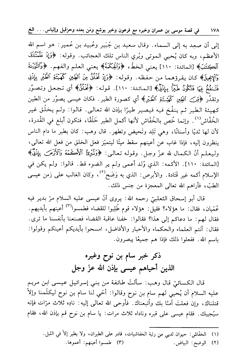 إلى أن صعد به إلى السماء . وقال سعيد بن جبير وعبيد بن عمير : هو اسم الله الأعظم ، وبه كان يحيي الموتى ويرى الناس تلك العجائب . وقوله : " وإذ علمنك الكتاب " يعني الخط ، " والحكمة " يعني العلم والفهم . " والتوراة والإنجيل " كان يقرؤهما من حفظه . وقوله : " وإذ تخلق من الطين كهيئة الطير بإذني فتنفخ فيها فتكون طيراً بإذني " . قوله : " تخلق " أي تجعل وتصور وتقدر " من الطين كهيئة الطير " أي كصورة الطير . فكان عيسى يصور من الطين كهيئة الطير ثم ينفخ فيه فيصير طيراً بإذن الله تعالى . قالوا : ولم يخلق غير الخفاش . وإنما خص بالخفاش لأنها أكمل الطير خلقاً ، فتكون أبلغ في القدرة ، لأن لها ثدياً وأسناناً ، وهي تلد وتحيض وتطهر . قال وهب : كان يطير ما دام الناس ينظرون إليه ، فإذا غاب عن أعينهم سقط ميتاً ليتميز فعل الخلق من فعل الله تعالى ، وليعلم أن الكمال لله عز وجل . وقوله تعالى : " وتبرئ الأكمه والأبرص بإذني " . الأكمه : الذي ولد أعمى ولم ير الضوء قط . قالوا : ولم يكن في الإسلام أكمه غير قتادة . والأبرص : الذي به وضح ، وكان الغالب على زمن عيسى الطب ، فأراهم الله تعالى المعجزة من جنس ذلك .
