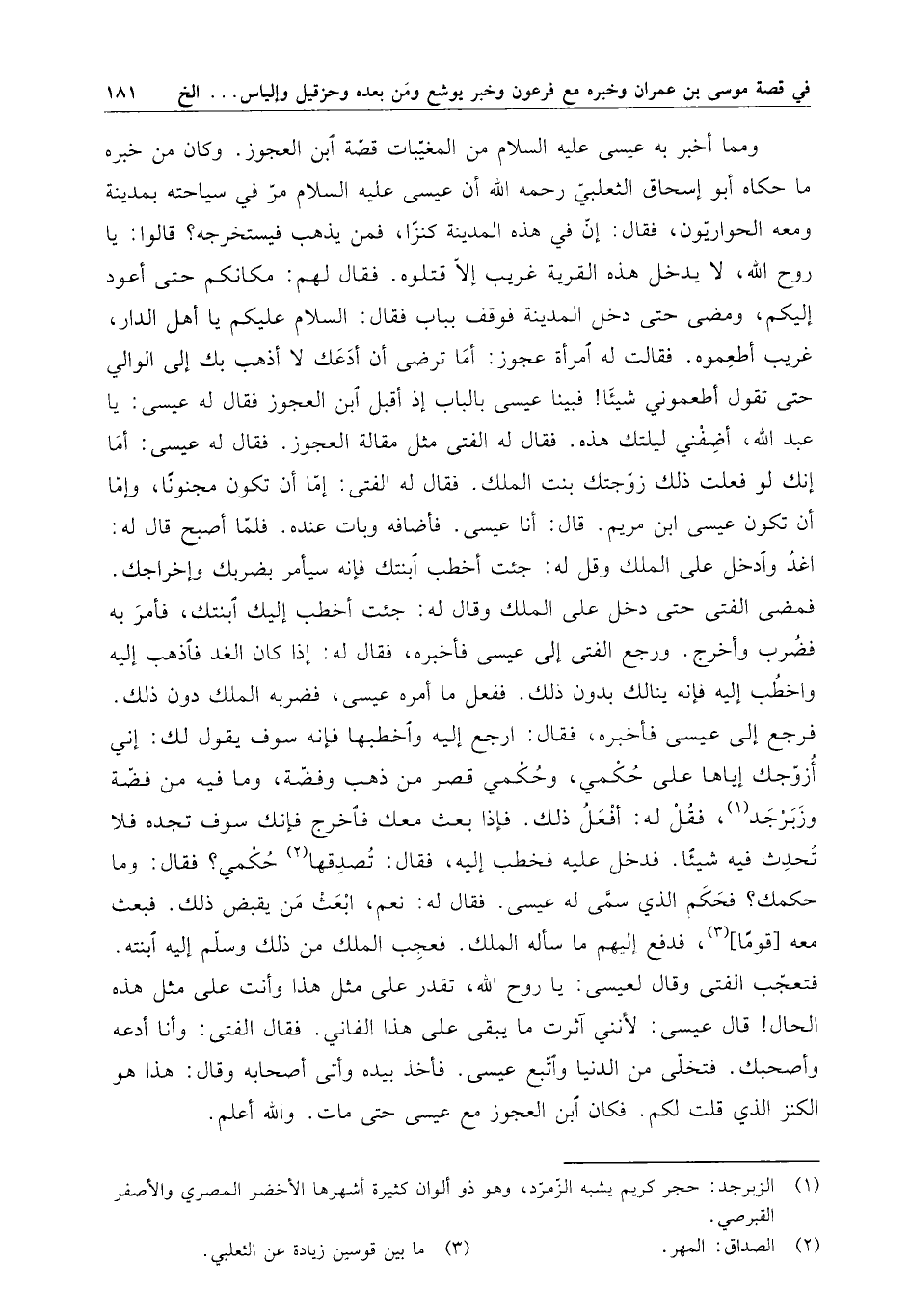 ومما أخبر به عيسى - ع - من المغيبات قصة ابن العجوز . وكان من خبره ما حكاه أبو إسحاق الثعلبي رحمه الله أن عيسى - ع - مر في سياحته بمدينة ومعه الحواريون ، فقال : إن في هذه المدينة كنزا ، فمن يذهب فيستخرجه ؟ . قالوا : يا روح الله ، لا يدخل هذه القرية غريب إلا قتلوه . فقال لهم : مكانكم حتى أعود إليكم ، ومضى حتى دخل المدينة فوقف بباب فقال : السلام عليكم يأهل الدار ، غريب أطعموه . فقالت له امرأة عجوز : أما ترضى أن أدعك لا أذهب بك إلى الوالي حتى تقول أطعموني شيئاً . فبينا عيسى بالباب إذ أقبل ابن العجوز فقال له عيسى : يا عبد الله ، أضفني ليلتك هذه . فقال له الفتى مثل مقالة العجوز . فقال له عيسى : أما إنك لو فعلت ذلك زوجتك بنت الملك . فقال له الفتى : إما أن تكون مجنوناً ، وإما أن تكون عيسى بن مريم . قال : أنا عيسى . فأضافه وبات عنده . فلما أصبح قال له : اغد وادخل على الملك وقل له : جئت أخطب ابنتك فإنه سيأمر بضربك وإخراجك . فمضى الفتى حتى دخل على الملك وقال له : جئت أخطب إليك ابنتك ، فأمر به فضرب وأخرج . ورجع الفتى إلى عيسى فأخبره ، فقال له : إذا كان الغد فاذهب إليه واخطب إليه فإنه ينالك بدون ذلك . ففعل ما أمر عيسى ، فضربه الملك دون ذلك . فرجع إلى عيسى فأخبره ، فقال : إرجع إليه واخطبها فإنه سوف يقول لك : إني أزوجك إياها على حكمى ، وحكمى قصر من ذهب وفضة ، وما فيه من فضة وزبرجد ، فقل له : أفعل ذلك . فإذا بعث معك فاخرج فإنك سوف تجده فلا تحدث فيه شيئاً . فدخل عليه فخطب إليه ، فقال : تصدقها حكمى ؟ فقال : وما حكمك ؟ فحكم الذي سمي له عيسى . فقال له : نعم ، ابعث من يقبض ذلك . فبعث معه قوماً ، فدفع إليهم ما سأله الملك . فعجب الملك من ذلك وسلم إليه ابنته . فتعجب الفتى وقال لعيسى : يا روح الله ، تقدر على مثل هذا وأنت على مثل هذه الحال . قال عيسى : لأنني آثرت ما يبقى على هذا الفاني . فقال الفتى : وأنا أدعه وأصحبك . فتخلى من الدنيا واتبع عيسى . فأخذ بيده وأتى أصحابه وقال : هذا هو الكنز الذي قلت لكم . فكان ابن العجوز مع عيسى حتى مات . والله أعلم .