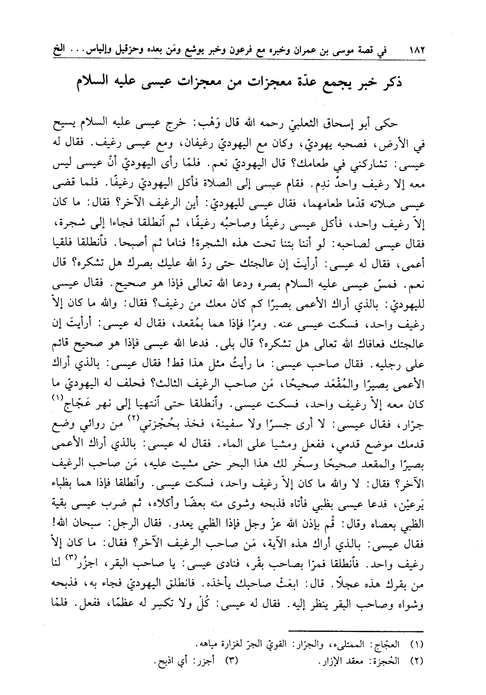 حكى أبو إسحاق الثعلبي رحمه الله قال وهب : خرج عيسى - ع - يسيح في الأرض ، فصحبه يهودي ، وكان مع اليهودي رغيفان ، ومع عيسى رغيف . فقال له عيسى : تشاركني في طعامك ؟ قال اليهودي نعم . فلما رأى اليهودي أن عيسى ليس معه إلا رغيف واحد ندم . فقام عيسى إلى الصلاة فأكل اليهودي رغيفاً . فلما قضى عيسى صلاته قدما طعامهما ، فقال عيسى لليهودي : أين الرغيف الآخر ؟ فقال : ما كان إلا رغيف واحد ، فأكل عيسى رغيفاً وصاحبه رغيفاً ، ثم انطلقا فجاءا إلى شجرة ، فقال عيسى لصاحبه : لو أننا بتنا تحت هذه الشجرة . فناما ثم أصبحا . فانطلقا فلقيا أعمى ، فقال له عيسى : أرأيت إن عالجتك حتى رد الله عليك بصرك هل تشكره ؟ قال نعم . فمس عيسى - ع - بصره ودعا الله تعالى فإذا هو صحيح . فقال عيسى لليهودي : بالذي أراك الأعمى بصيراً كم كان معك من رغيف ؟ فقال : والله ما كان إلا رغيف واحد ، فسكت عيسى عنه . ومرا فإذا هما بمقعد ، فقال له عيسى : أرأيت إن عالجتك فعافاك الله تعالى هل تشكره ؟ قال بلى . فدعا الله عيسى فإذا هو صحيح قائم على رجليه . فقال صاحب عيسى : ما رأيت مثل هذا قط . فقال عيسى : بالذي أراك الأعمى بصيراً والمقعد صحيحاً ، من صاحب الرغيف الثالث ؟ فحلف له اليهودي ما كان معه إلا رغيف واحد ، فسكت عيسى . وانطلقا حتى انتهيا إلى نهر عجاج جرار ، فقال عيسى : لا أرى جسراً ولا سفينة ، فخذ بحجزتي من ورائي وضع قدمك موضع قدمي ، ففعل ومشيا على الماء . فقال له عيسى : بالذي أراك الأعمى بصيراً والمقعد صحيحاً وسخر لك هذا البحر حتى مشيت عليه ، من صاحب الرغيف الآخر ؟ فقال : لا والله ما كان إلا رغيف واحد ، فسكت عيسى . وانطلقا فإذا هما بظباء يرعين ، فدعا عيسى بظبي فأتاه فذبحه وشوى منه بعضاً وأكلاه ، ثم ضرب عيسى بقية الظبي بعصاه وقال : قم بإذن الله عز وجل فإذا الظبي يعدو . فقال الرجل : سبحان الله . فقال عيسى : بالذي أراك هذه الآية ، من صاحب الرغيف الآخر ؟ فقال : ما كان إلا رغيف واحد . فانطلقا فمرا بصاحب بقر ، فنادى عيسى : يا صاحب البقر ، اجزر لنا من بقرك هذه عجلاً . قال : ابعث صاحبك يأخذه . فانطلق اليهودي فجاء به ، فذبحه وشواه وصاحب البقر ينظر إليه . فقال له عيسى : كل ولا تكسر له عظماً ، ففعل . فلما
