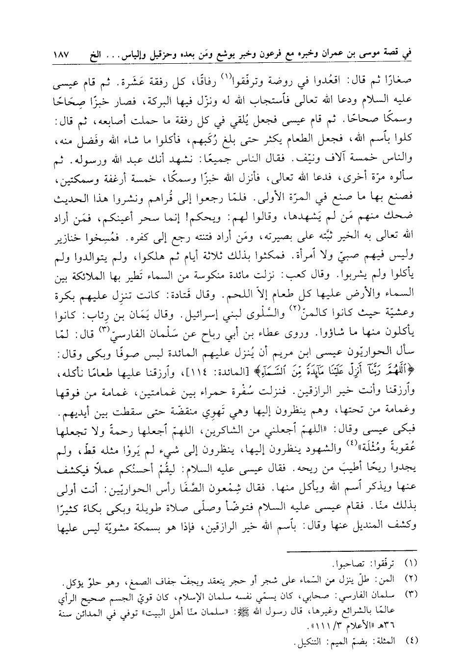 صغاراً ثم قال : اقعدوا في روضة وترفقوا رفاقاً ، كل رفقة عشرة . ثم قام عيسى - ع - ودعا الله تعالى فاستجاب الله له ونزل فيها البركة ، فصار خبزاً صحاحاً وسمكاً صحاحاً . ثم قام عيسى فجعل يلقى في كل رفقة ما حملت أصابعه ، ثم قال : كلوا باسم الله ، فجعل الطعام يكثر حتى بلغ ركبهم ، فأكلوا ما شاء الله وفضل منه ، والناس خمسة آلاف ونيف . فقال الناس جميعاً : نشهد أنك عبد لله ورسوله . ثم سألوه مرة أخرى ، فدعا الله تعالى ، فأنزل الله خبزاً وسمكاً ، خمسة أرغفة وسمكتين ، فصنع بها ما صنع في المرة الأولى . فلما رجعوا إلى قراهم ونشروا هذا الحديث ضحك منهم من لم يشهدها ، وقالوا لهم : ويحكم إنما سحر أعينكم ، فمن أراد الله تعالى به الخير ثبته على بصيرته ، ومن أراد فتنته رجع إلى كفره . فمسخوا خنازير وليس فيهم صبي ولا امرأة . فمكثوا بذلك ثلاثة أيام ثم هلكوا ، ولم يتوالدوا ولم يأكلوا ولم يشربوا . وقال كعب : نزلت مائدة منكوسة من السماء تطير بها الملائكة بين السماء والأرض عليها كل طعام إلا اللحم . وقال قتادة : كانت تنزل عليهم بكرة وعشية حيث كانوا كالمن والسلوى لبني إسرائيل . وقال يمان بن رئاب : كانوا يأكلون منها ما شاءوا . وروى عطاء بن أبي رباح عن سلمان الفارسي قال : لما سأل الحواريون عيسى ابن مريم أن ينزل عليهم المائدة لبس صوفاً وبكى وقال : " اللهم ربنا أنزل علينا مائدة من السماء " الآية ، وأرزقنا عليها طعاماً نأكله ، وارزقنا وأنت خير الرازقين . فنزلت سفرة حمراء بين غمامتين ، غمامة من فوقها وغمامة من تحتها ، وهم ينظرون إليها وهي تهوي منقضة حتى سقطت بين أيديهم . فبكى عيسى وقال : " اللهم اجعلني من الشاكرين ، اللهم اجعلها رحمة ولا تجعلها عقوبة ومثلة " والشهود ينظرون إليها ، ينظرون إلى شيء لم يروا مثله قط ، ولم يجدوا ريحاً أطيب من ريحه . فقال عيسى - ع - : ليقم أحسنكم عملاً فيكشف عنها ويذكر اسم الله ويأكل منها . فقال شمعون الصفا رأس الحوايين : أنت أولى بذلك منا . فقام عيسى - ع - فتوضأ وصلى صلاة طويلة وبكى بكاء كثيراً وكشف المنديل عنها وقال : باسم الله خير الرازقين . فإذا هو بسمكة مشوية ليس عليها